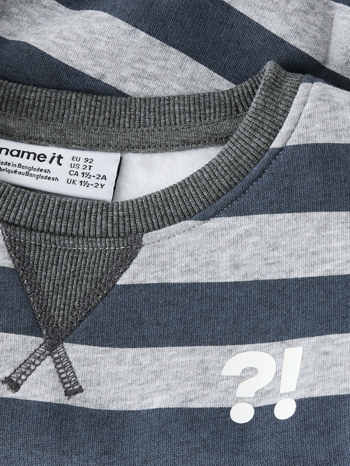 Es ist dunkelblau und grau gestreift und hat einen weißen Aufdruck auf Brusthöhe.