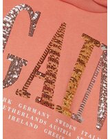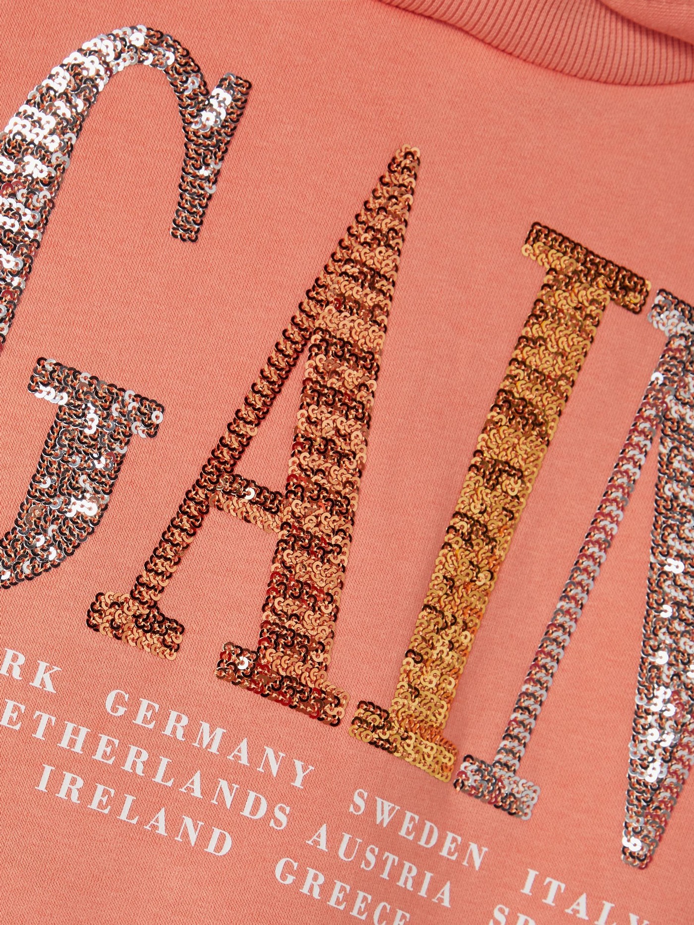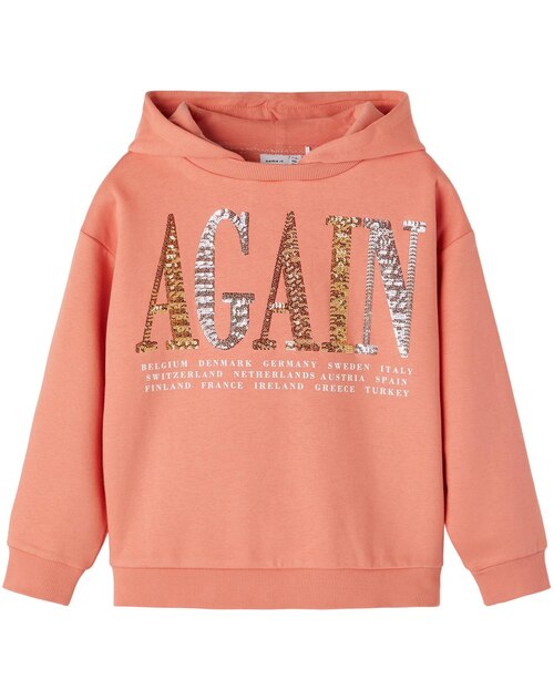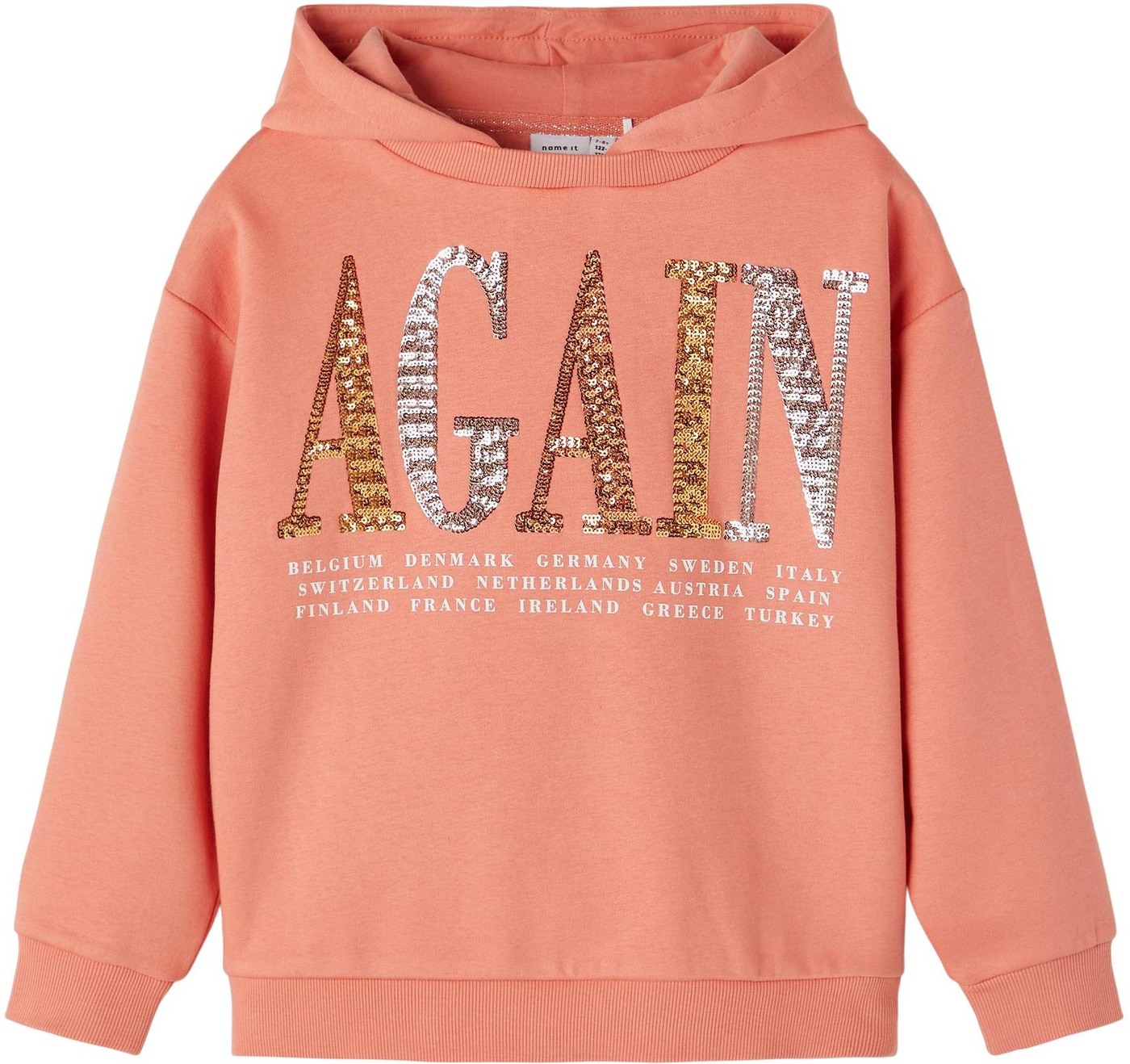 Sweatshirt von NAME IT für Mädchen mit Rundhalsausschnitt und Kapuze. Das angenehme Material und der lockere Schnitt bieten einen hohen Tragekomfort. Die Kapue ist mit Jersey gefüttert und das Sweatshirt ist innen weich angeraut. Ein schönes Detail ist die Applikation aus glitzernden Pailletten.