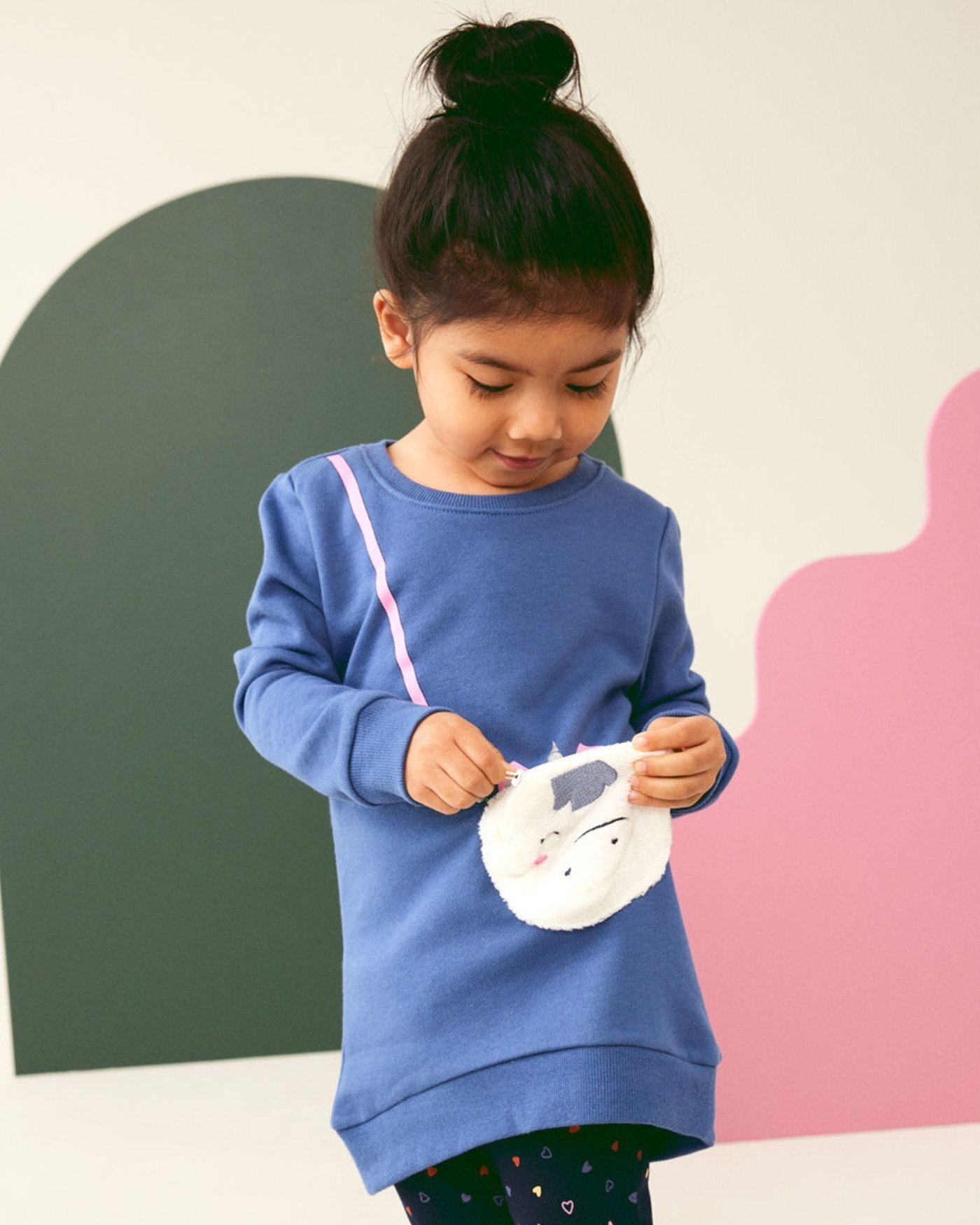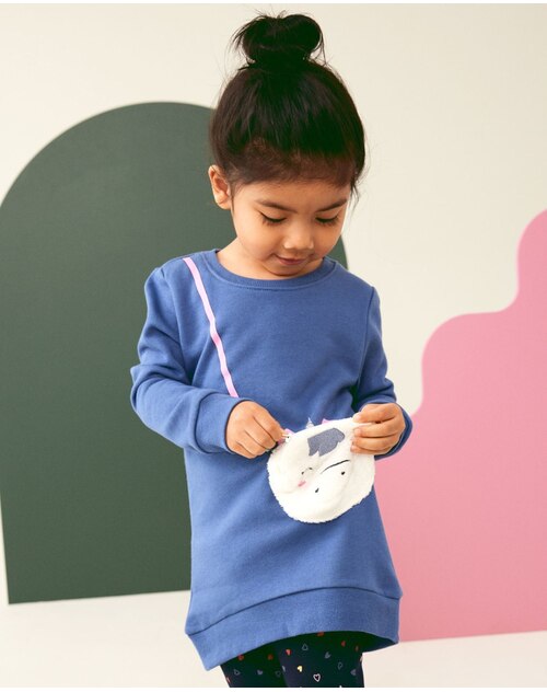 Lang geschnittenes Sweatshirt für Mädchen von NAME IT. Das Sweatshirt hat eine tolle Handtaschen-Applikation mit Einhorn und Glitzer auf der Vorderseite. Das Material aus organischer Baumwolle bietet einen hohen Tragekomfort. Das Sweatshirt lässt sich auch prima mit einer Leggings kombinieren. Innen ist es weich angeraut und dadurch kuschelig weich.