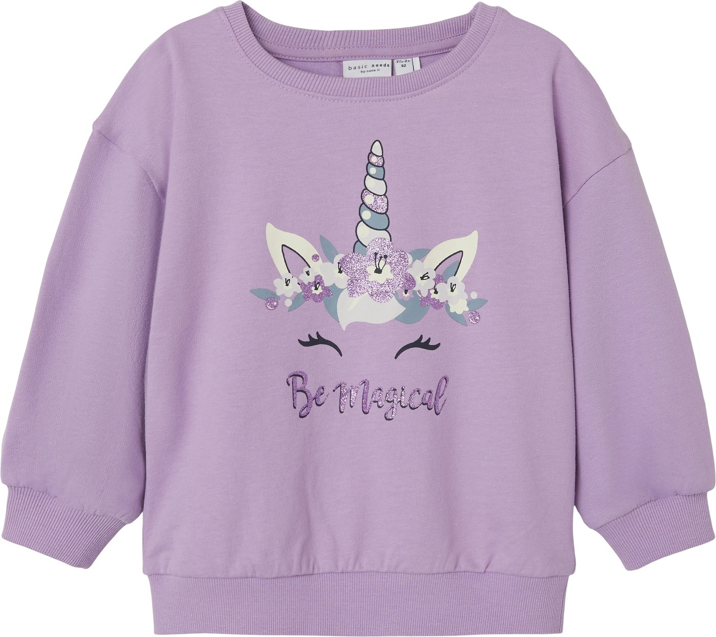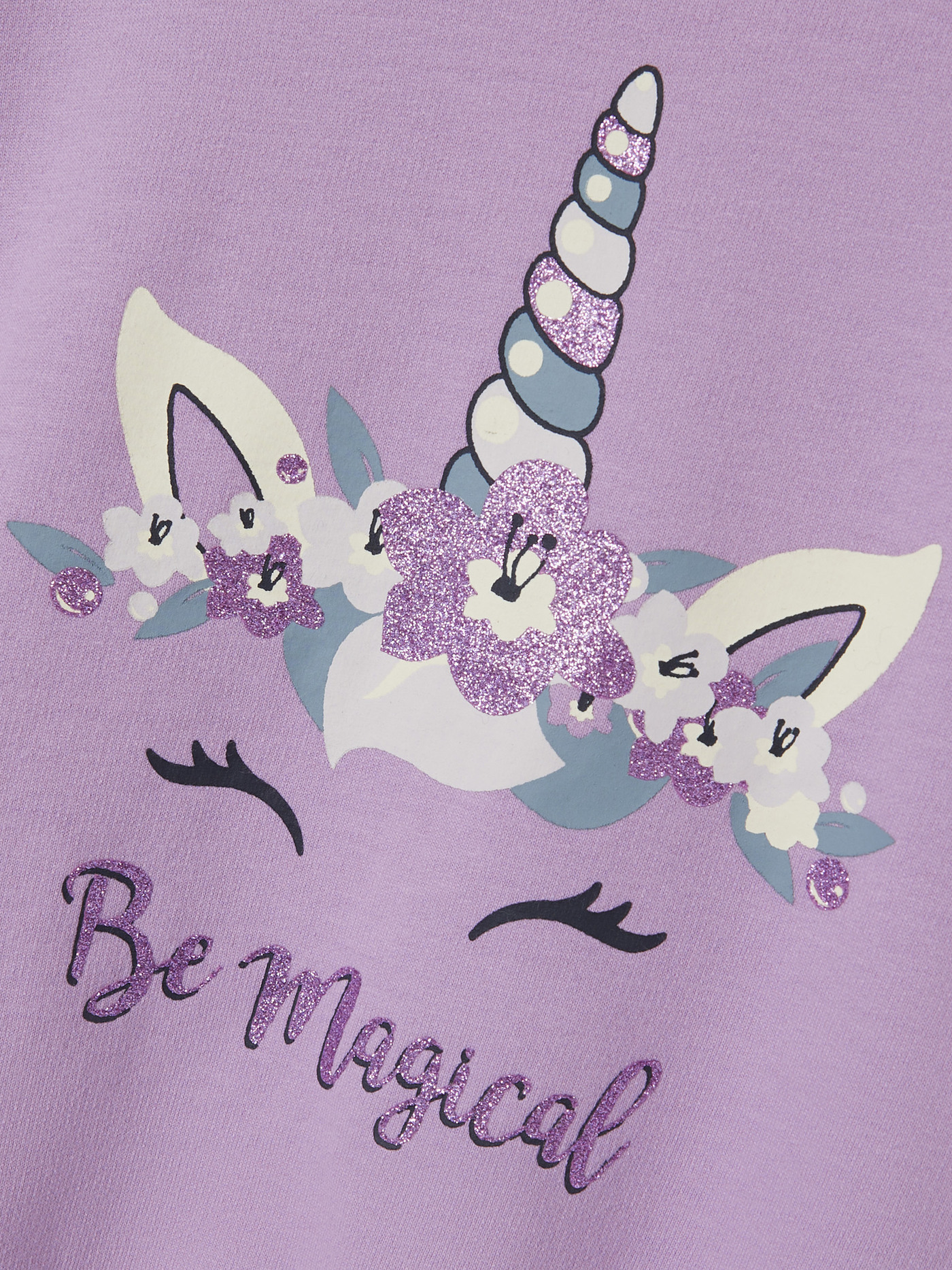 Ein Hingucker ist der niedliche Druck eines Einhorns, mit glitzernden Details, auf der Vorderseite.