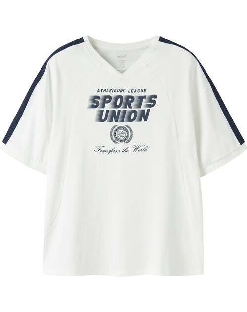 Der Druck mittig auf Brusthöhe und die farblich abgesetzten Streifen, die von den Schultern bis zu den Ärmelenden reichen, geben dem Shirt einen sportlichen Look. 😎