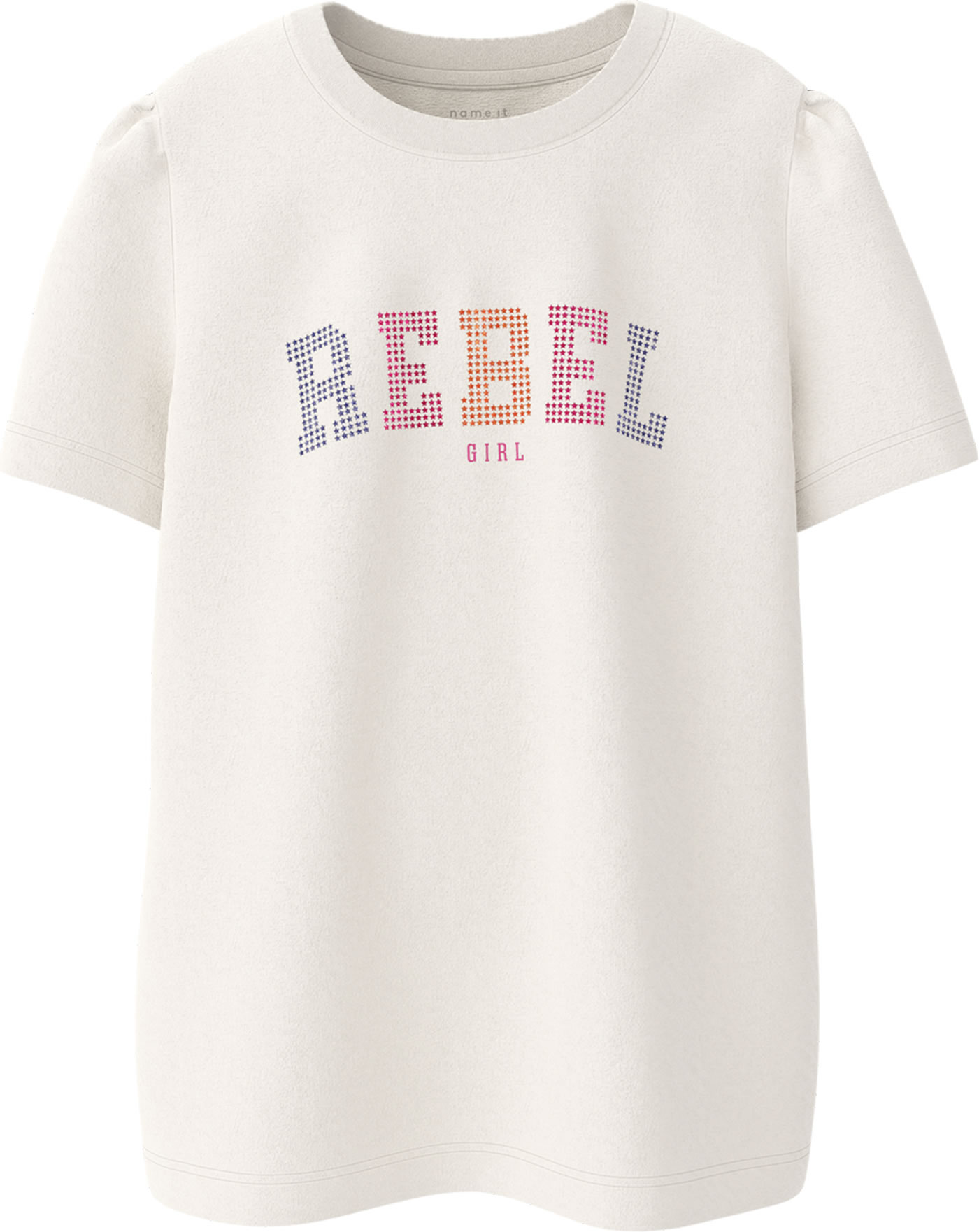 Tolles Kurzarmshirt für Mädchen von NAME IT. Das Shirt hat einen glitzernden Aufdruck auf der Vorderseite und die Ärmel sind an den Schultern leicht gerafft. Das weiche Material sorgt für einen hohen Tragekomfort.