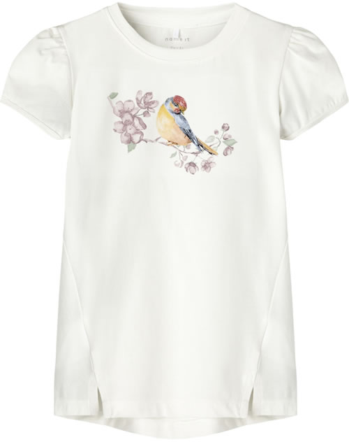 Schönes Kurzarmshirt für Mädchen mit leichten Puffärmeln von NAME IT. Ein tolles Detail ist das Vogelmotiv auf der Brust. Im Rücken ist das Shirt etwas länger geschnitten. Das weiche Material sorgt für einen hohen Tragekomfort.