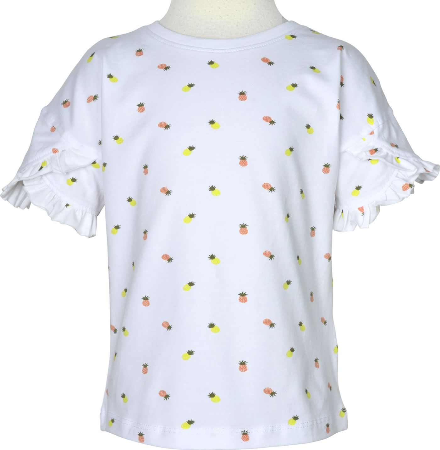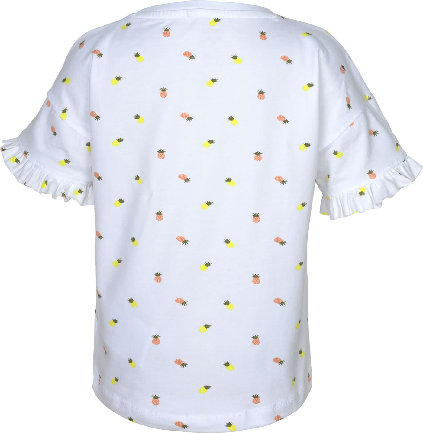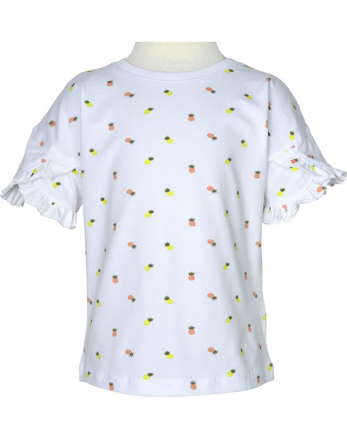 Kurzarmshirt für Mädchen von NAME IT. Das T-Shirt hat einen tollen Print aus Ananas-Motiven. Ein besonders schönes Detail Rüschen-Ärmel. Das weiche Material sorgt für einen hohen Tragekomfort.