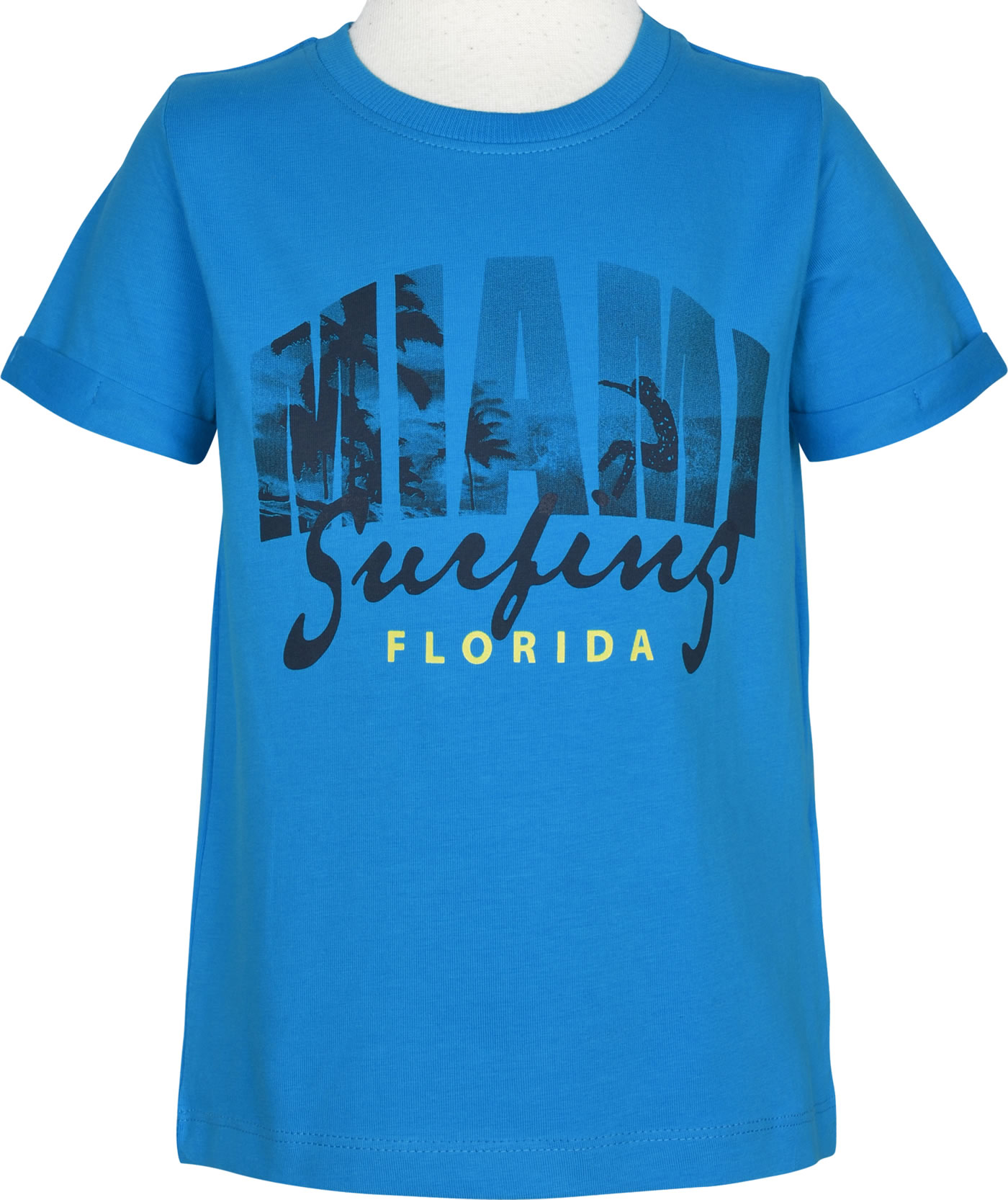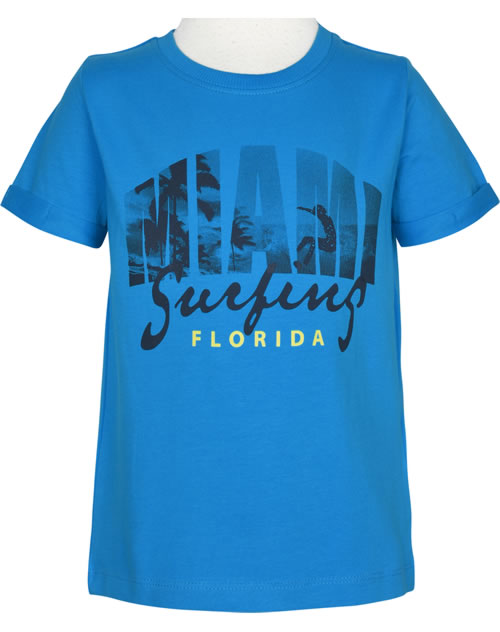 Blaues Kurzarmshirt für Jungen von NAME IT. Das T-Shirt hat einen tollen Miami Print mit auf der Vorderseite. Es hat einen lockeren Schnitt und läßt sich prima kombinieren.