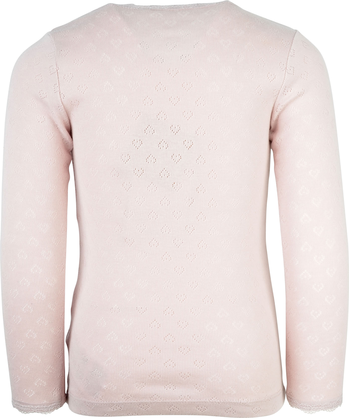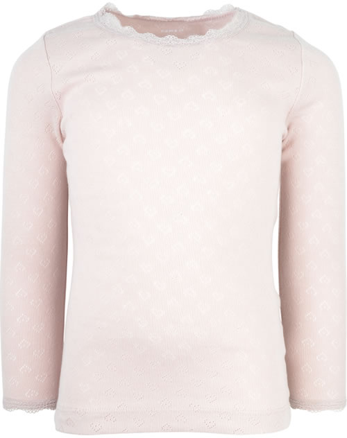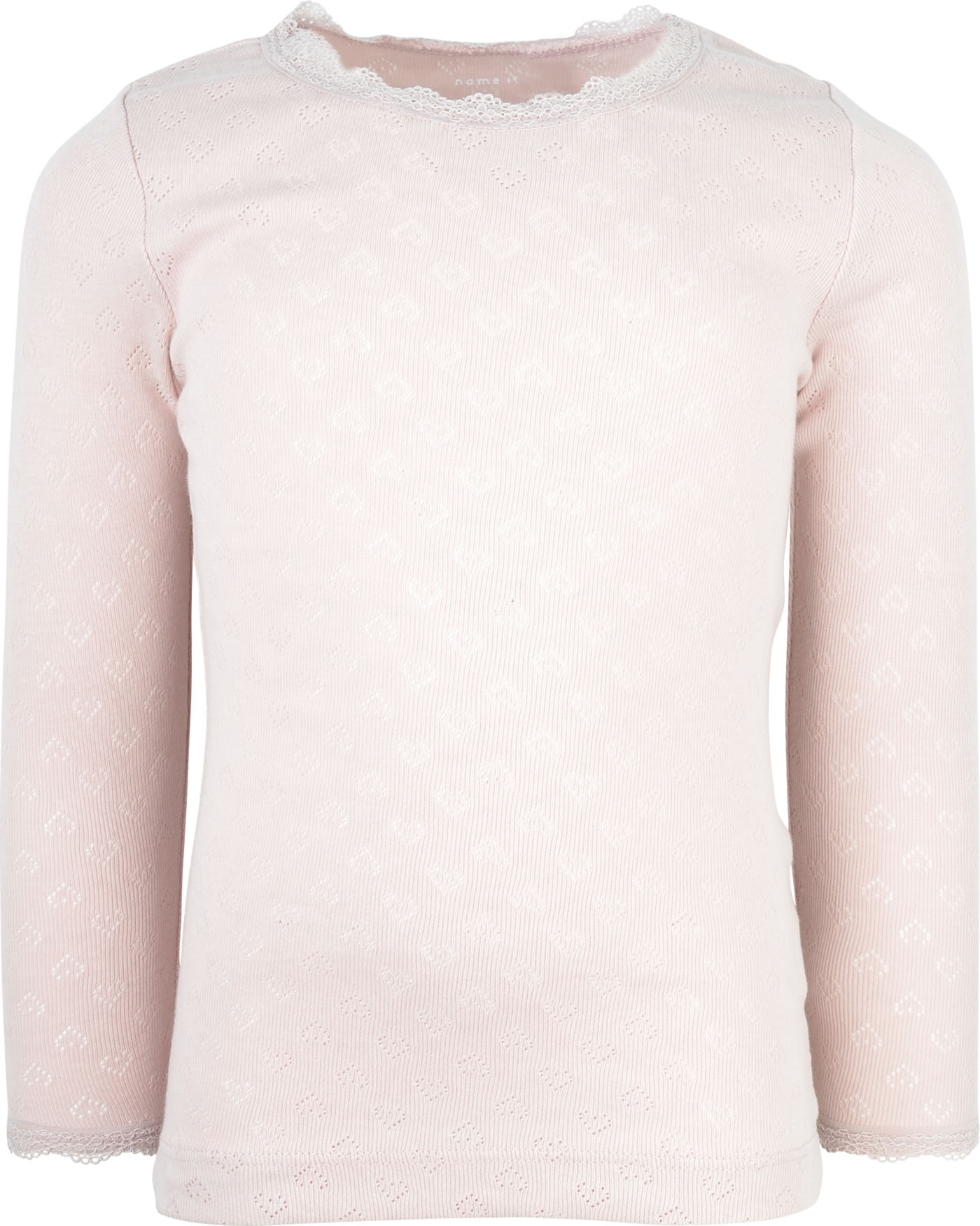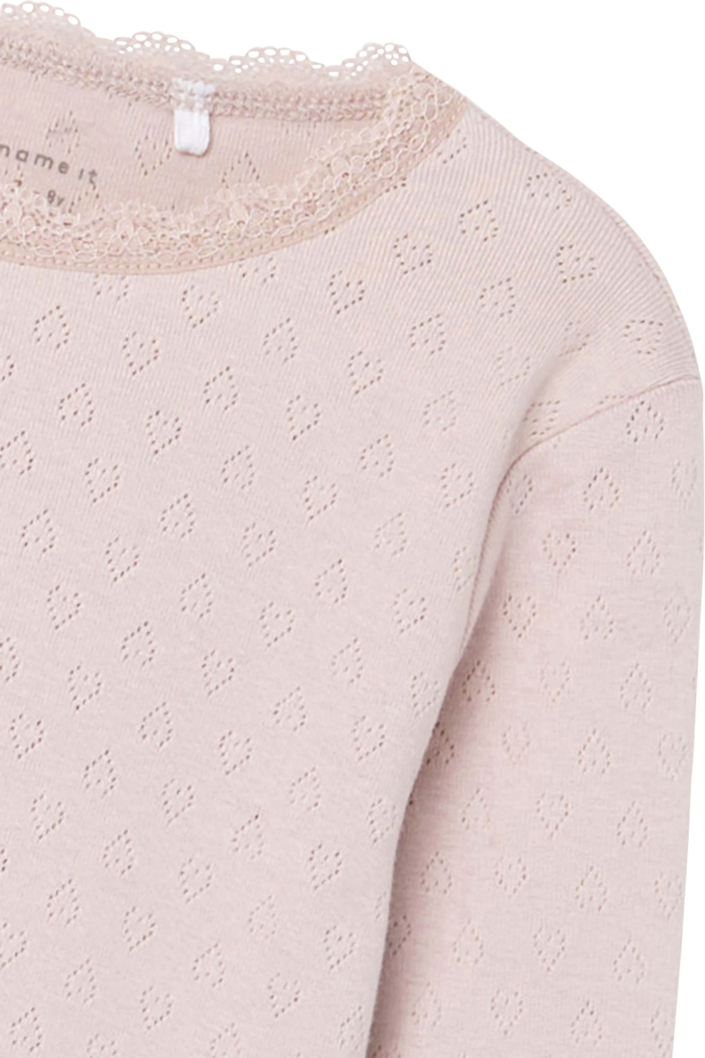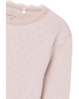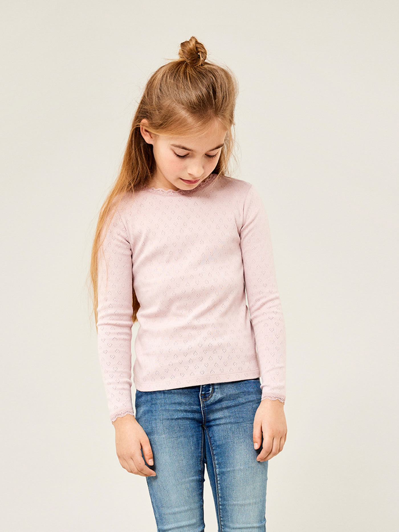 Langarmshirt für Mädchen von NAME IT. Das Shirt hat eine tolles Lochmuster in Herzform und die Saumabschlüsse am Hals und an den Ärmeln sind mit einer Spitze versehen. Das weiche Material sorgt für einen hohen Tragekomfort.