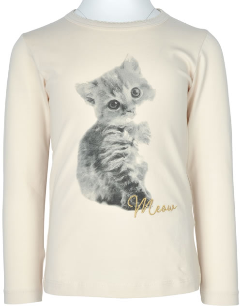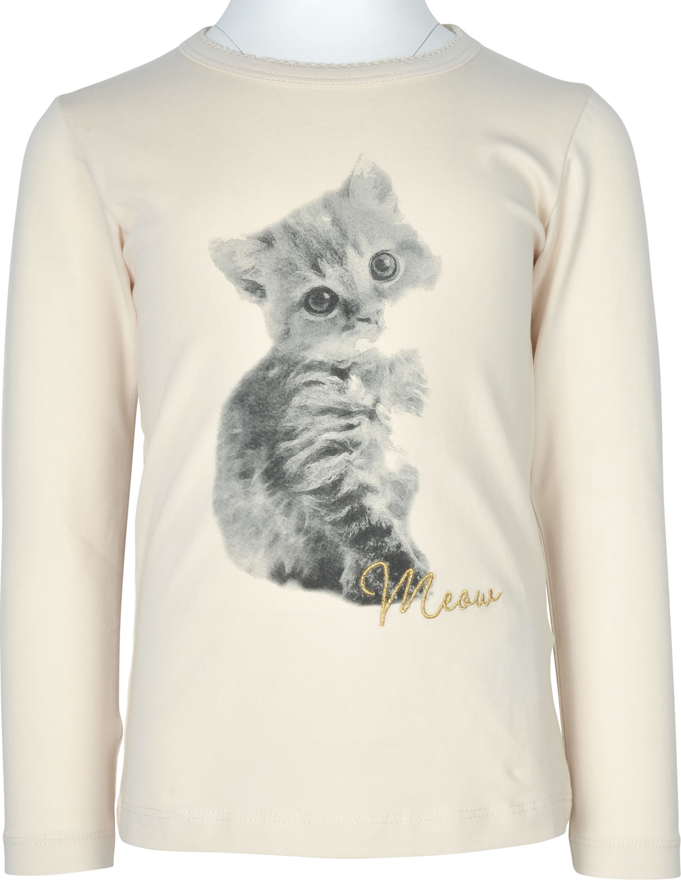 Langarmshirt für Mädchen aus organischer Baumwolle von NAME IT. Das T-Shirt hat einen tollen Katzen-Print auf der Vorderseite. Das weiche Material sorgt für einen hohen Tragekomfort. Ein wunderschönes Detail ist der Mäusezähnchenrand am Kragen.