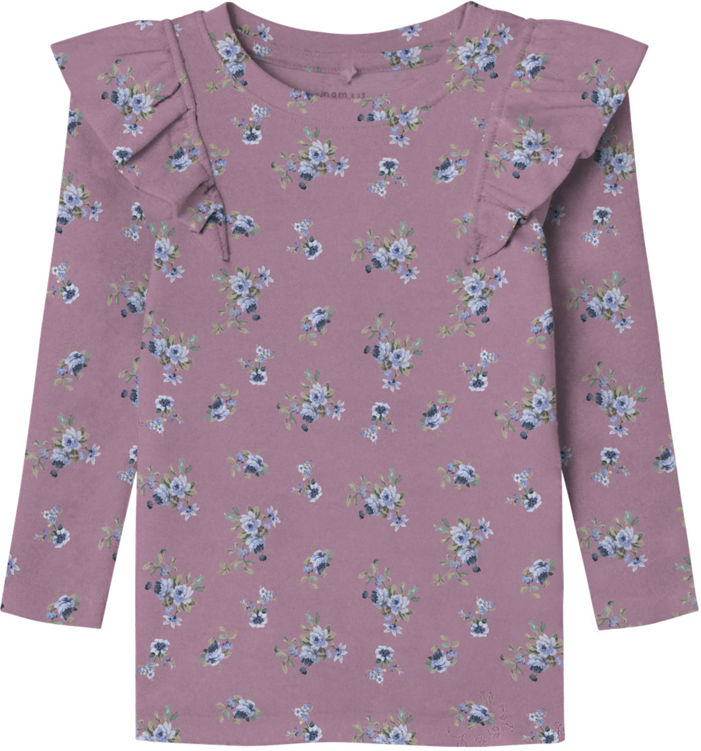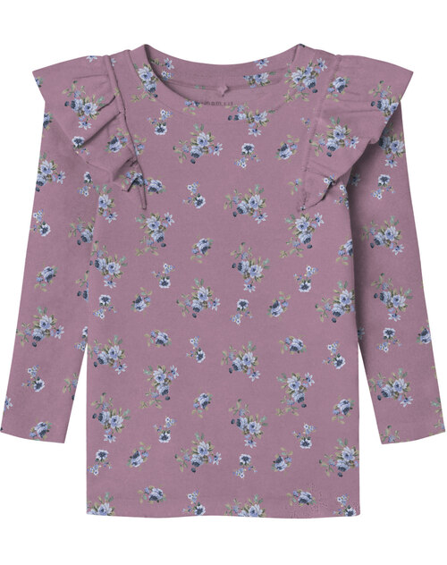 Langarmshirt für Mädchen von NAME IT. Das Shirt hat einen tolles Allover Blümchenmuster. Das weiche Material sorgt für einen hohen Tragekomfort. Ein schönes Detail sind die Rüschen an den Schultern.