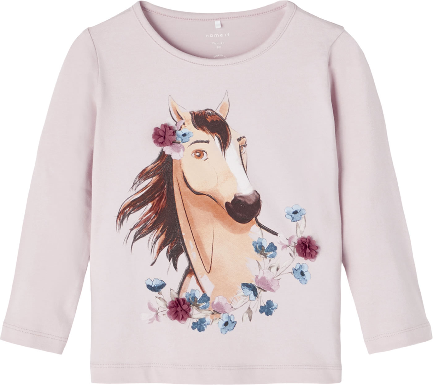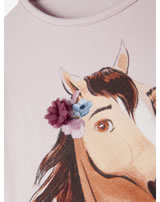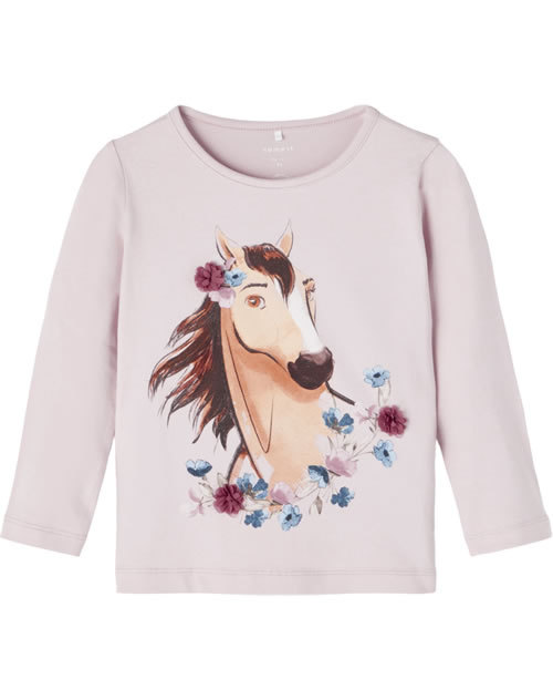 Langarmshirt für Mädchen von NAME IT. Das Shirt hat einen tollen Print mit dem wilden Mustang Spirit auf der Vorderseite. Schöne Details sind die Blüten aus Tüll. Das Material aus organischer Baumwolle bietet einen hohen Tragekomfort.