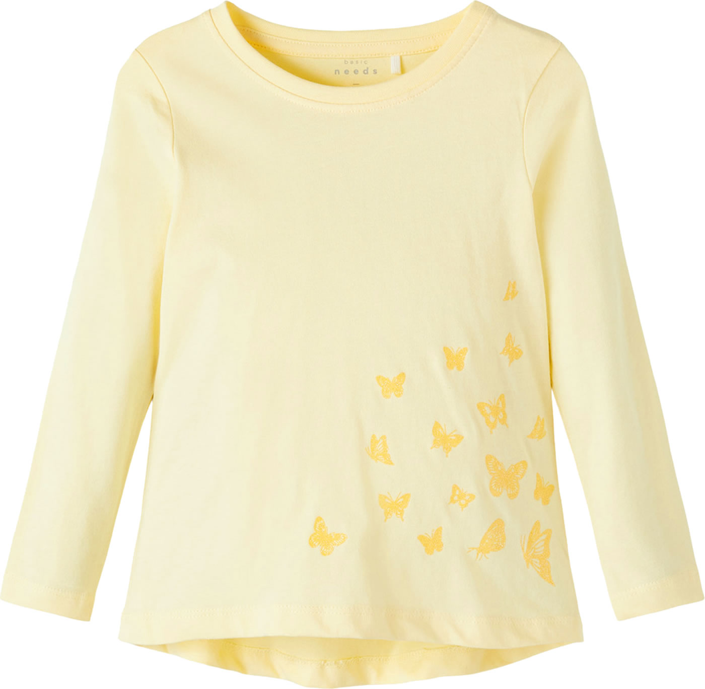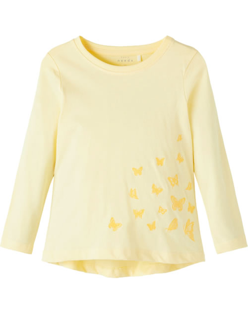 Langarmshirt für Mädchen von NAME IT. Das T-Shirt hat einen tollen Glitzer-Print aus Schmetterlingen auf der Vorderseite. Das weiche Material sorgt für einen hohen Tragekomfort. Die Rückseite ist etwas länger geschnitten.