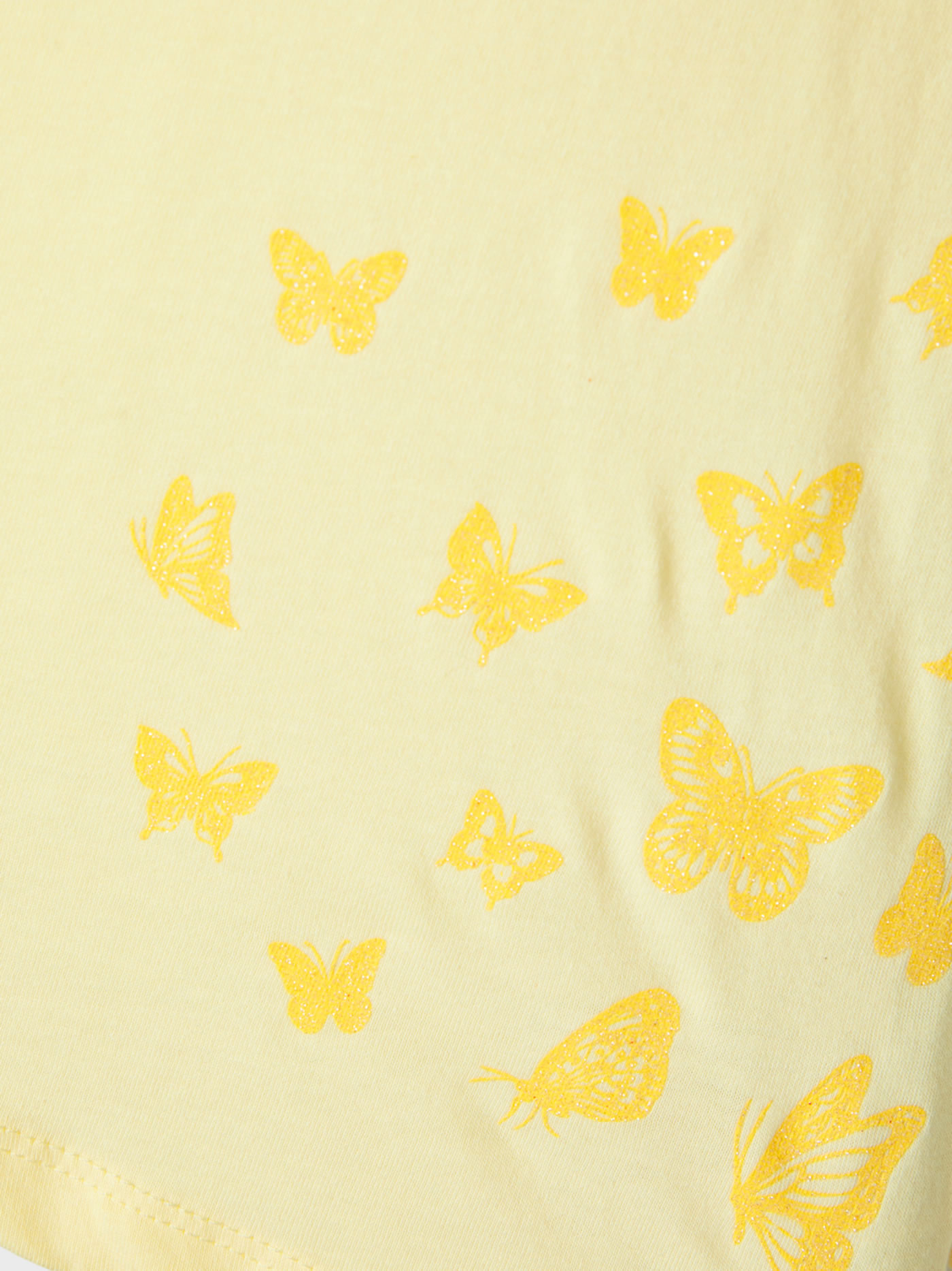 Sehr süßes Shirt, es leuchtet wunderschön in seinem Gelb und die glitzer Schmetterlinge runden das ganze perfekt ab.