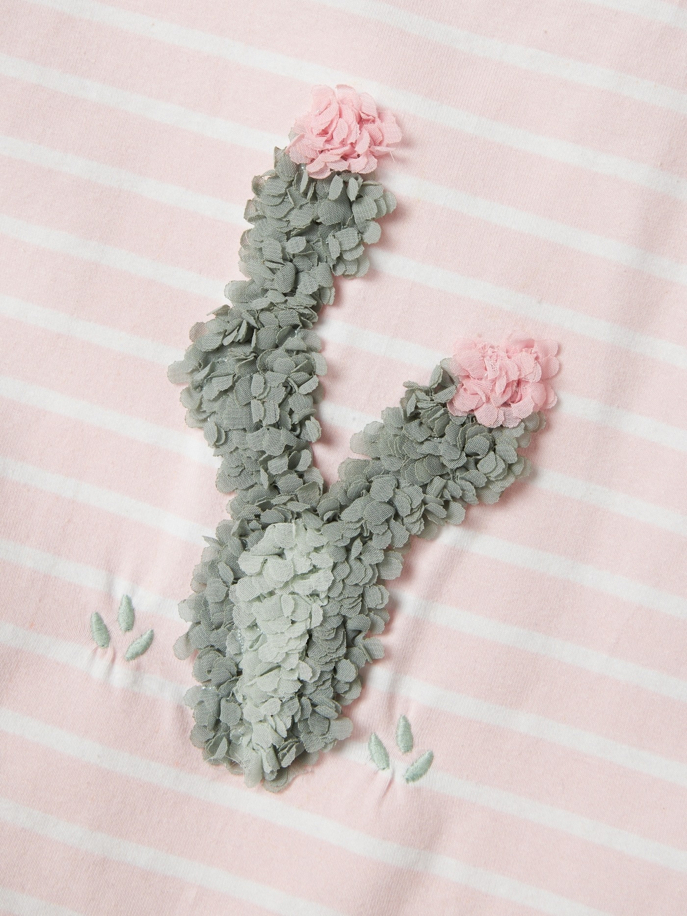 Das Streifendesign bringt frischen Wind in den Kleiderschrank, während Rüschen an den Ärmelbündchen liebevolle Akzente setzen.