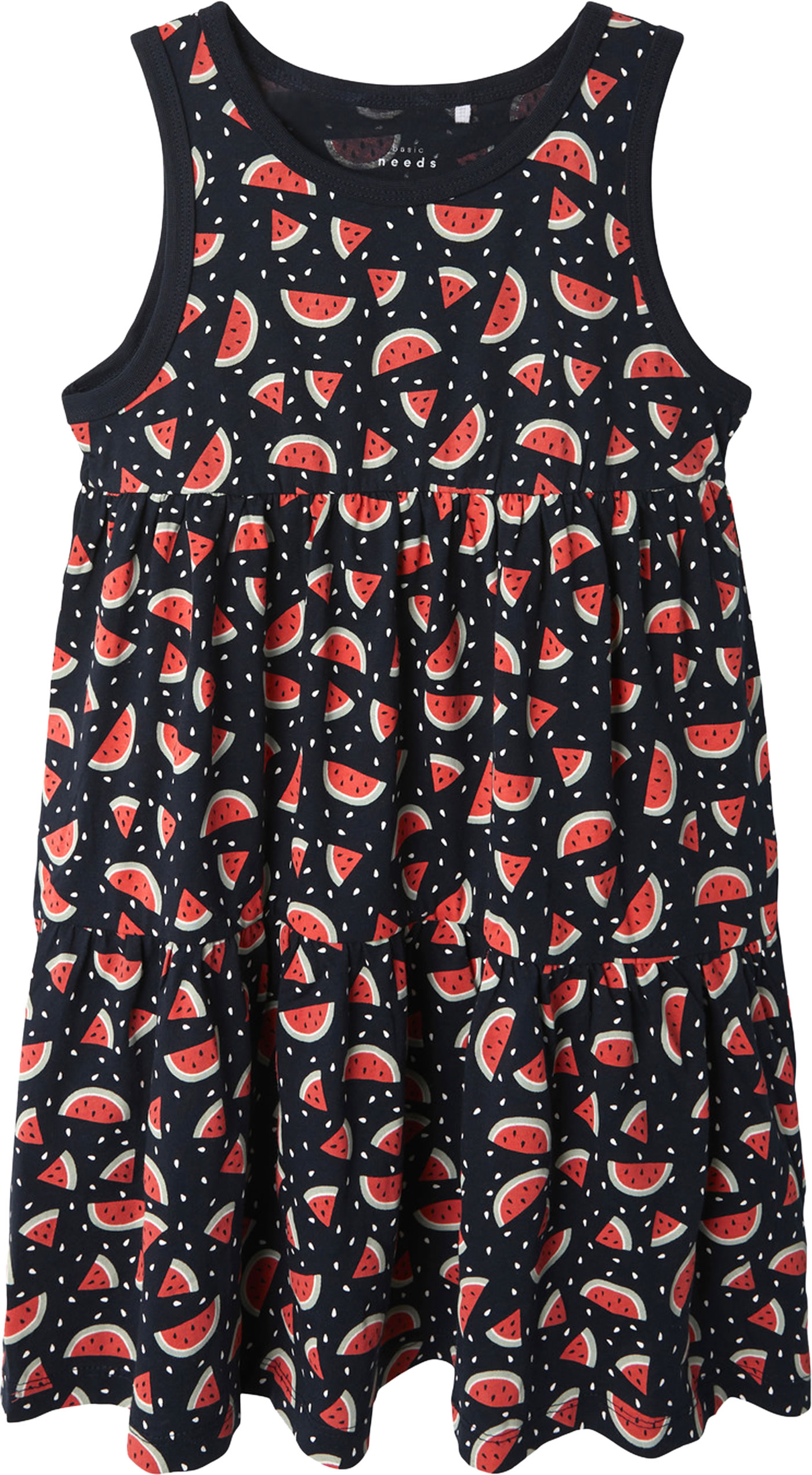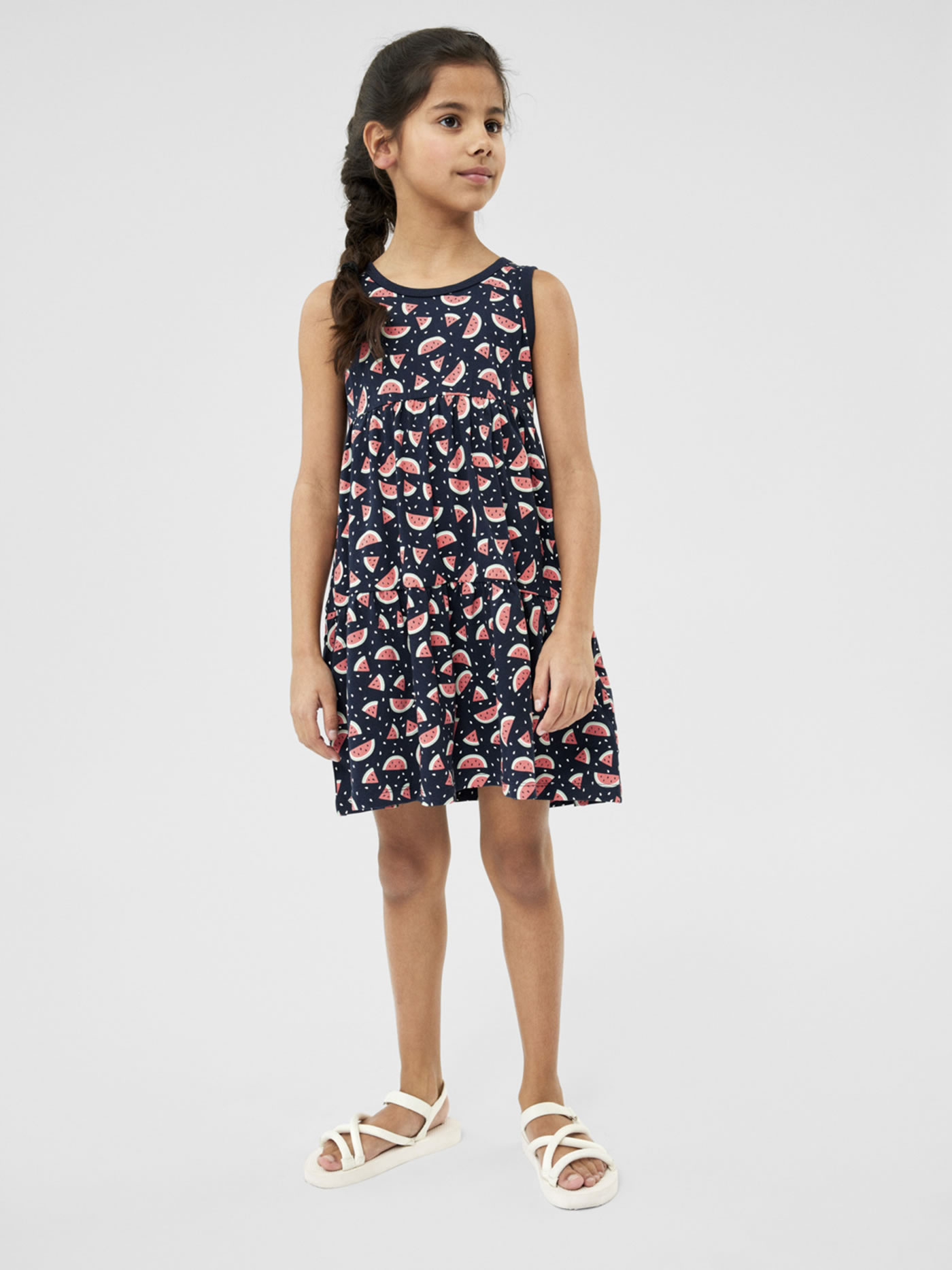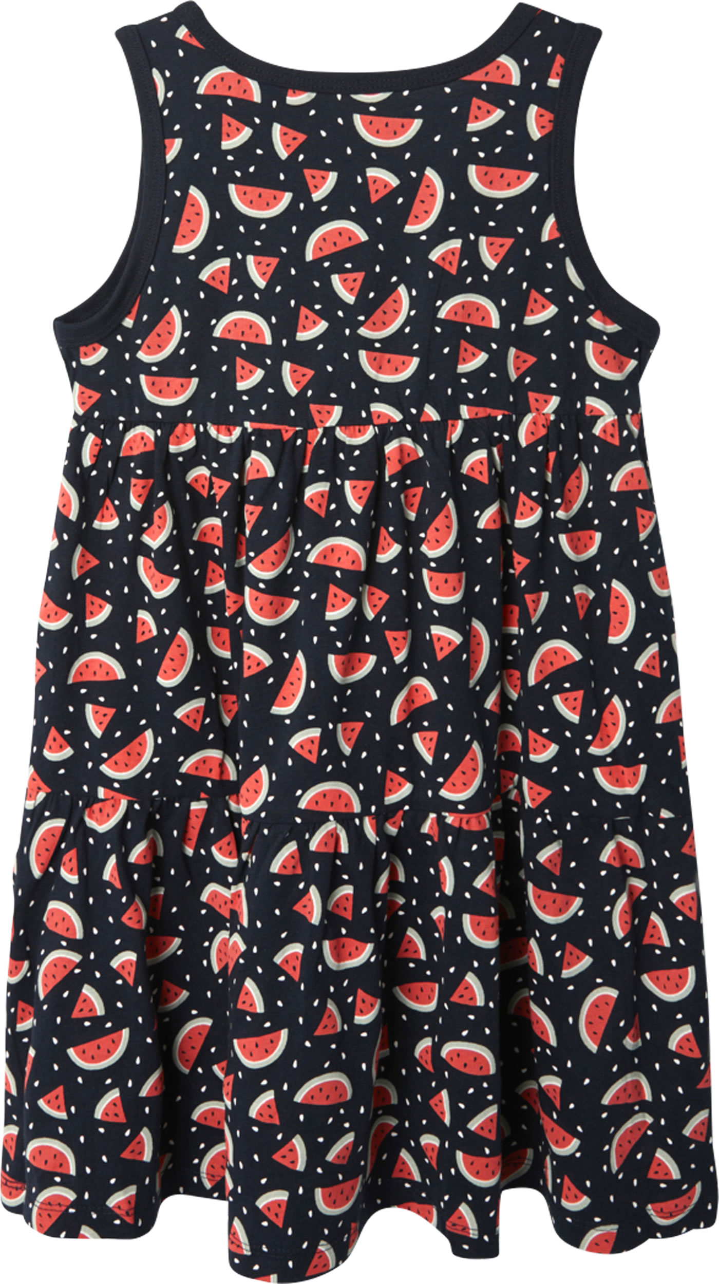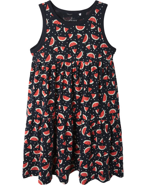 Hübsches Trägerkleid aus weichem Material von NAME IT. Das Kleid ist in A-Linie geschnitten und hat ein Wassermelonenmotiv. Das weiche luftige Material ist ideal für warme Sommertage.