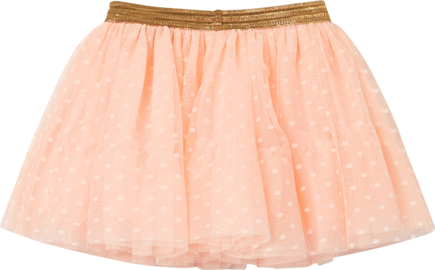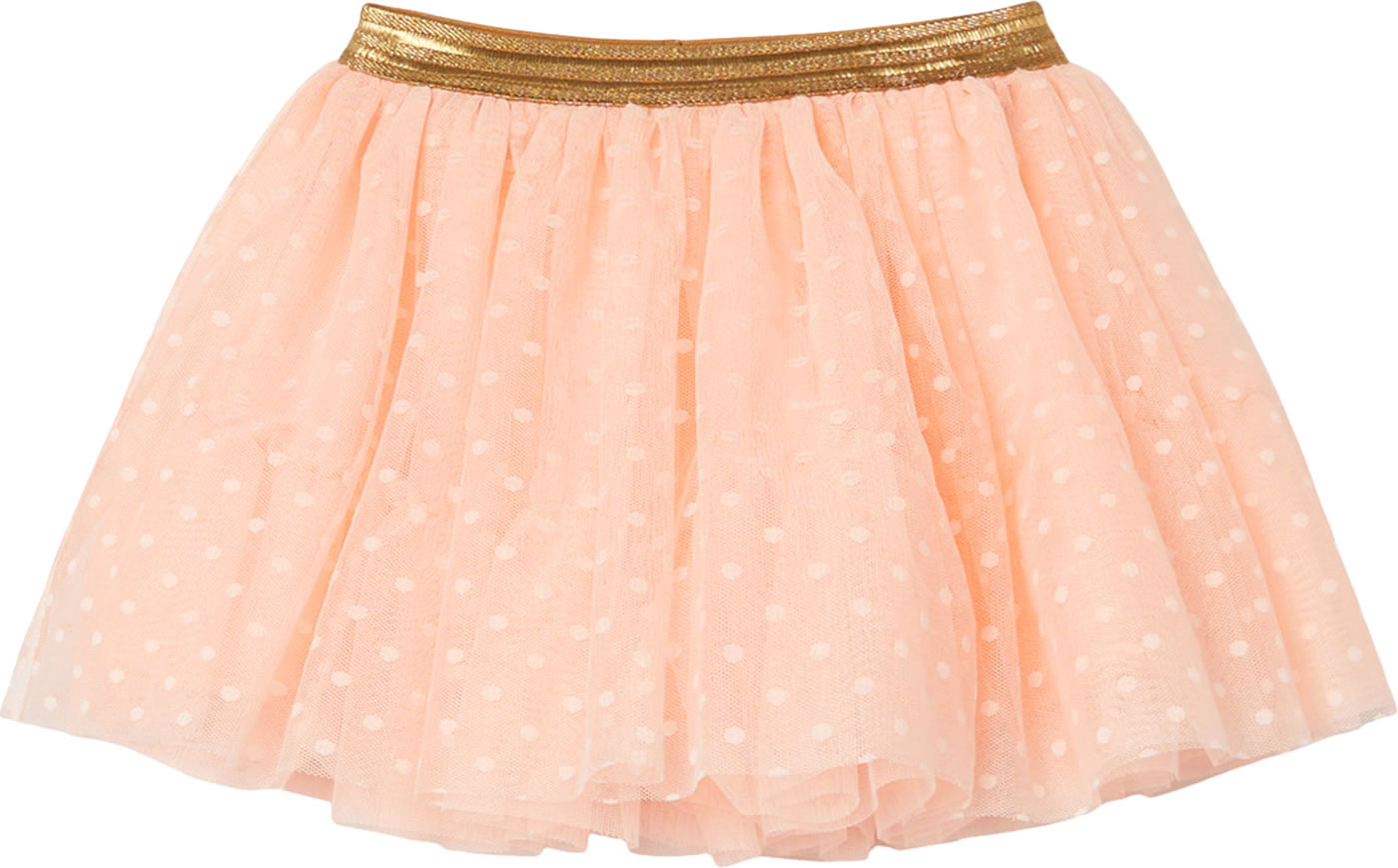 Weit fallender Tüll-Rock in apricot mit aufgestickten Punkten von NAME IT. Der goldglitzernde Gummizugbund sorgt für einen guten Sitz. Mit Unterrock.