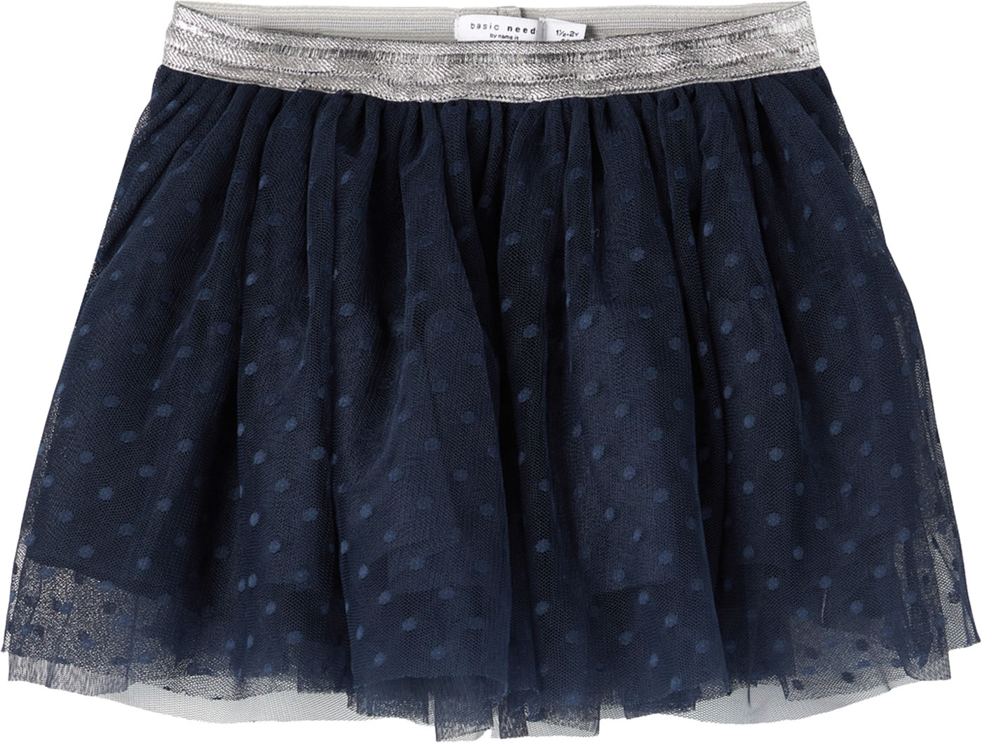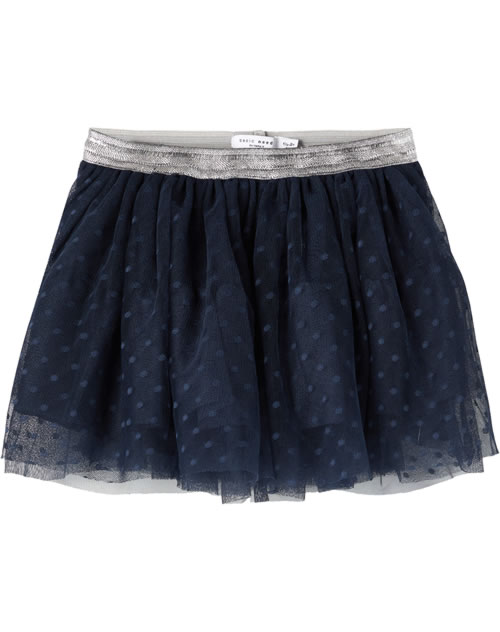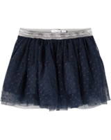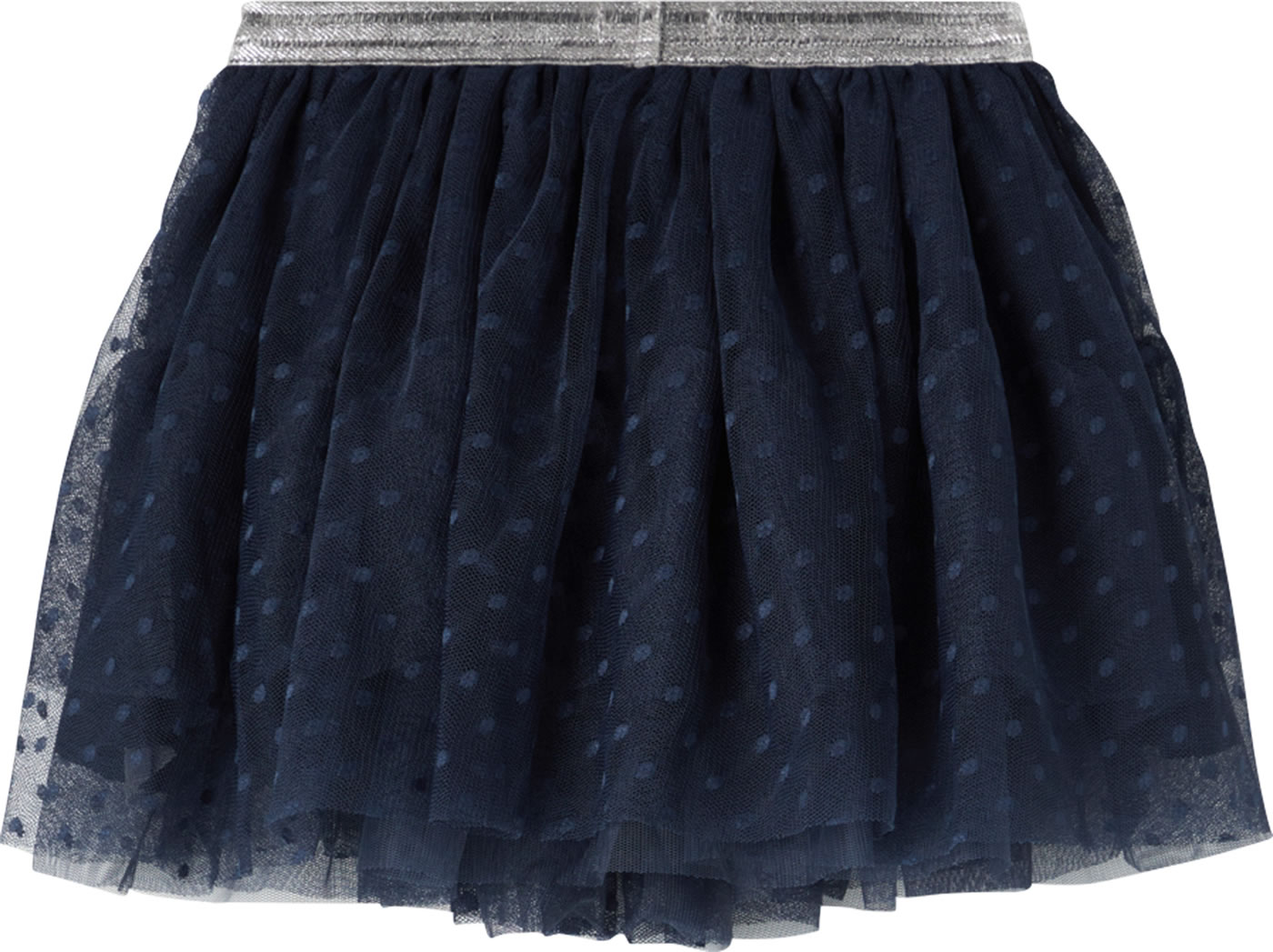 Weit fallender Tüll-Rock in dunkelblau mit aufgestickten Punkten von NAME IT. Der silberglitzernde Gummizugbund sorgt für einen guten Sitz. Mit Unterrock.