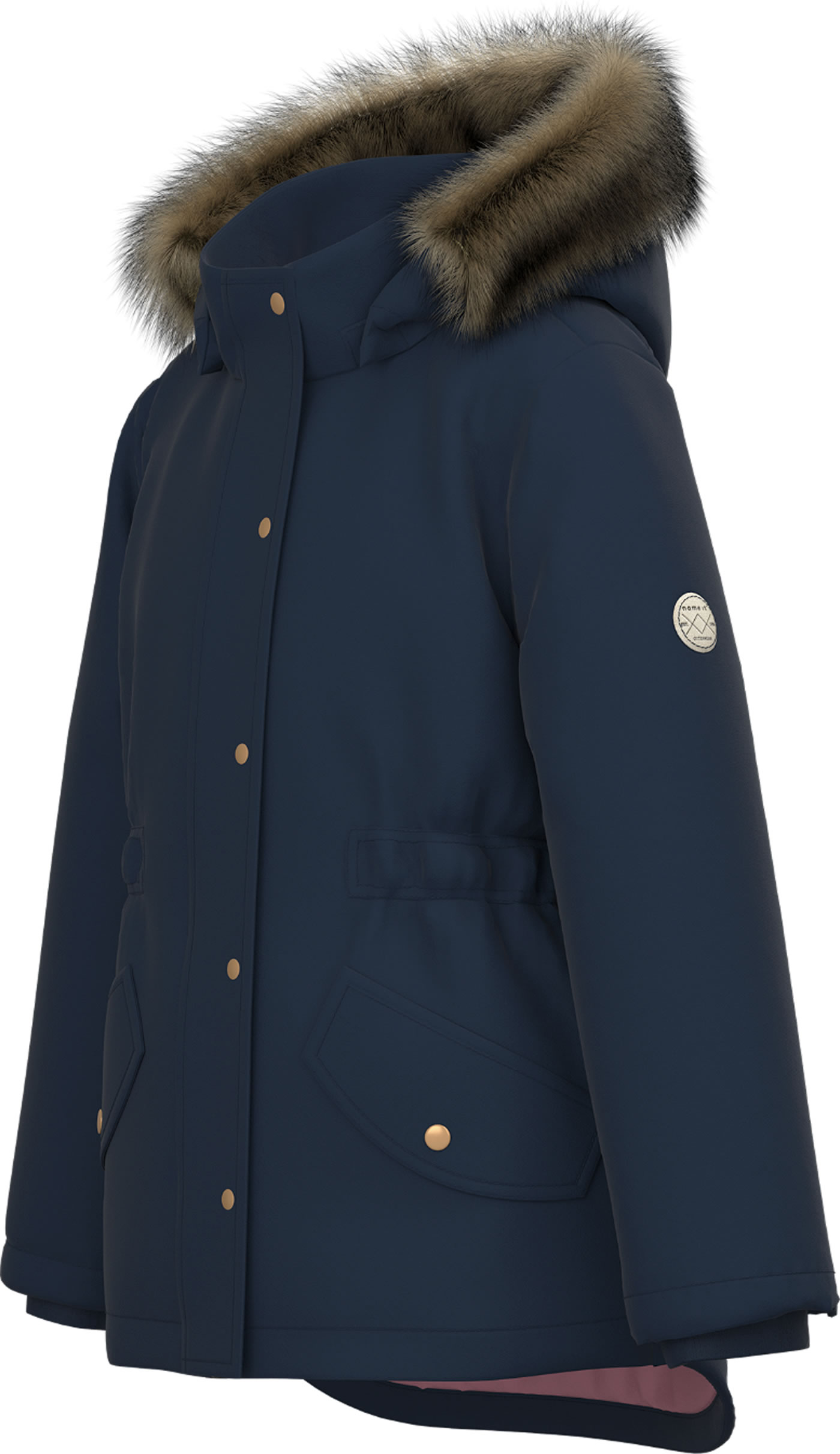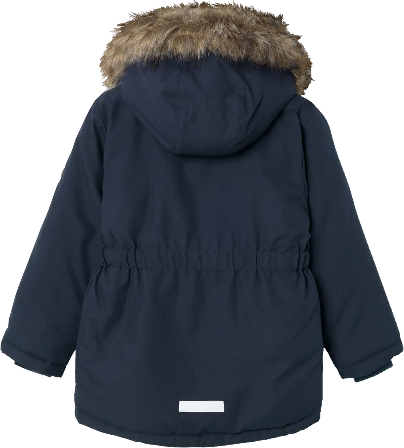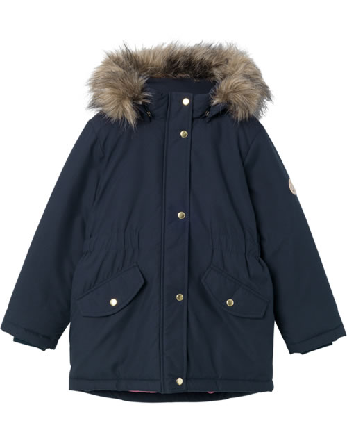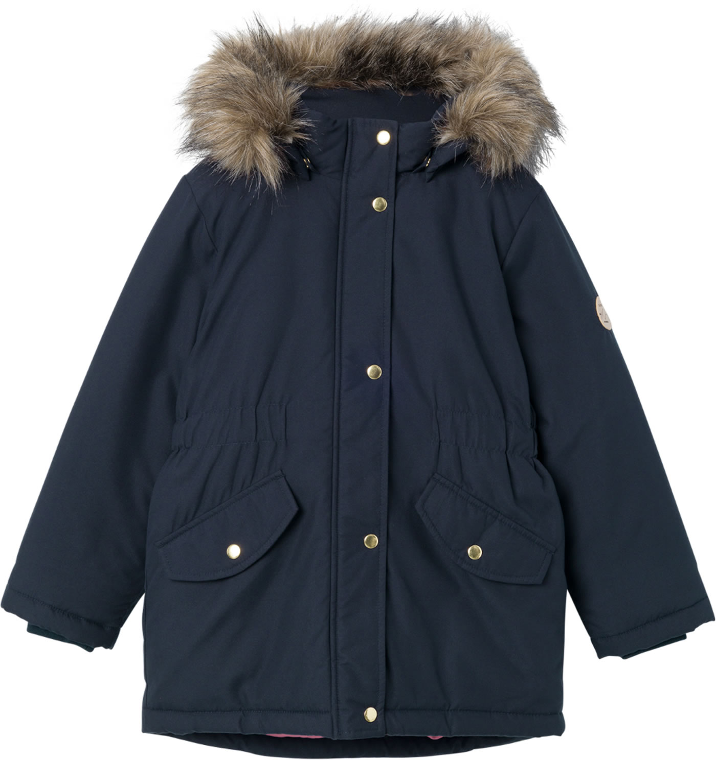 Winter-Parka in dark sapphire mit abnehmbarer Fell-Kapuze von NAME IT für Mädchen. Der Fellimitat-Besatz der Kapuze ist ebenfalls abknöpfbar. Auf der Vorderseite der Jacke befinden sich zwei Klappentaschen mit Druckknöpfen. Die Jacke ist wasserabweisend und lässt sich per Reißverschluss mit unterlegtem Windschutz schließen. In der Taille ist ein Gummizug eingearbeitet. Ein Reflektorstreifen auf der Rückseite sorgt für eine bessere Sichtbarkeit im Dunkeln. Die weichen Rippbündchen in den Ärmeln lassen keinen Wind hinein. Die wattierte Jacke ist ideal für kalte Tage und das Teddyplüsch-Futter in der Kapuze ist besonders kuschelig. Die BIONIC FINISH®ECO Imprägnierung basiert auf einer fluorfreien Rezeptur und hält die Farbe und das Gewebe länger neu.