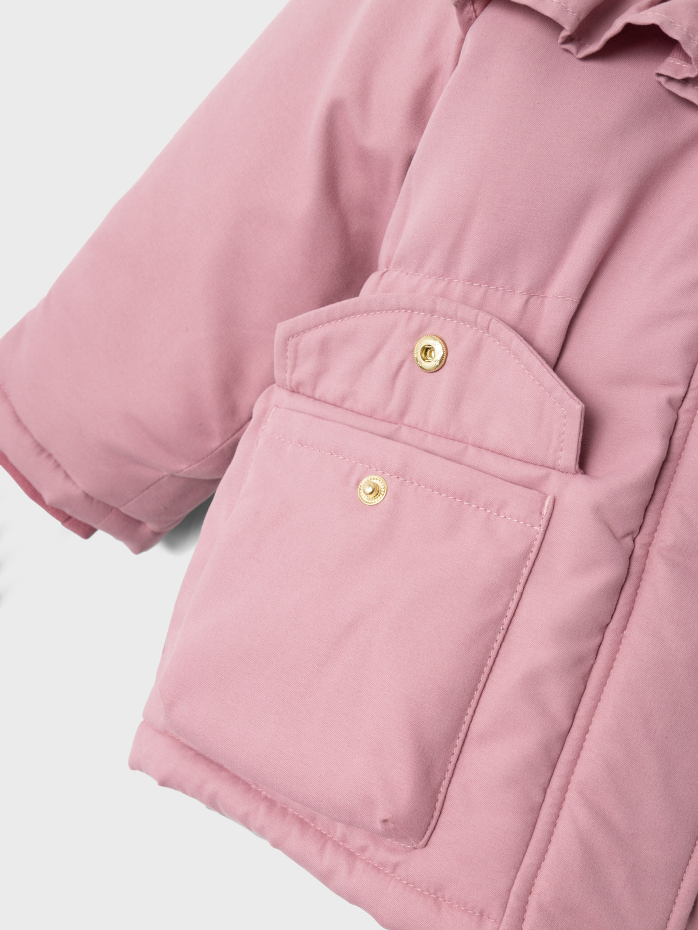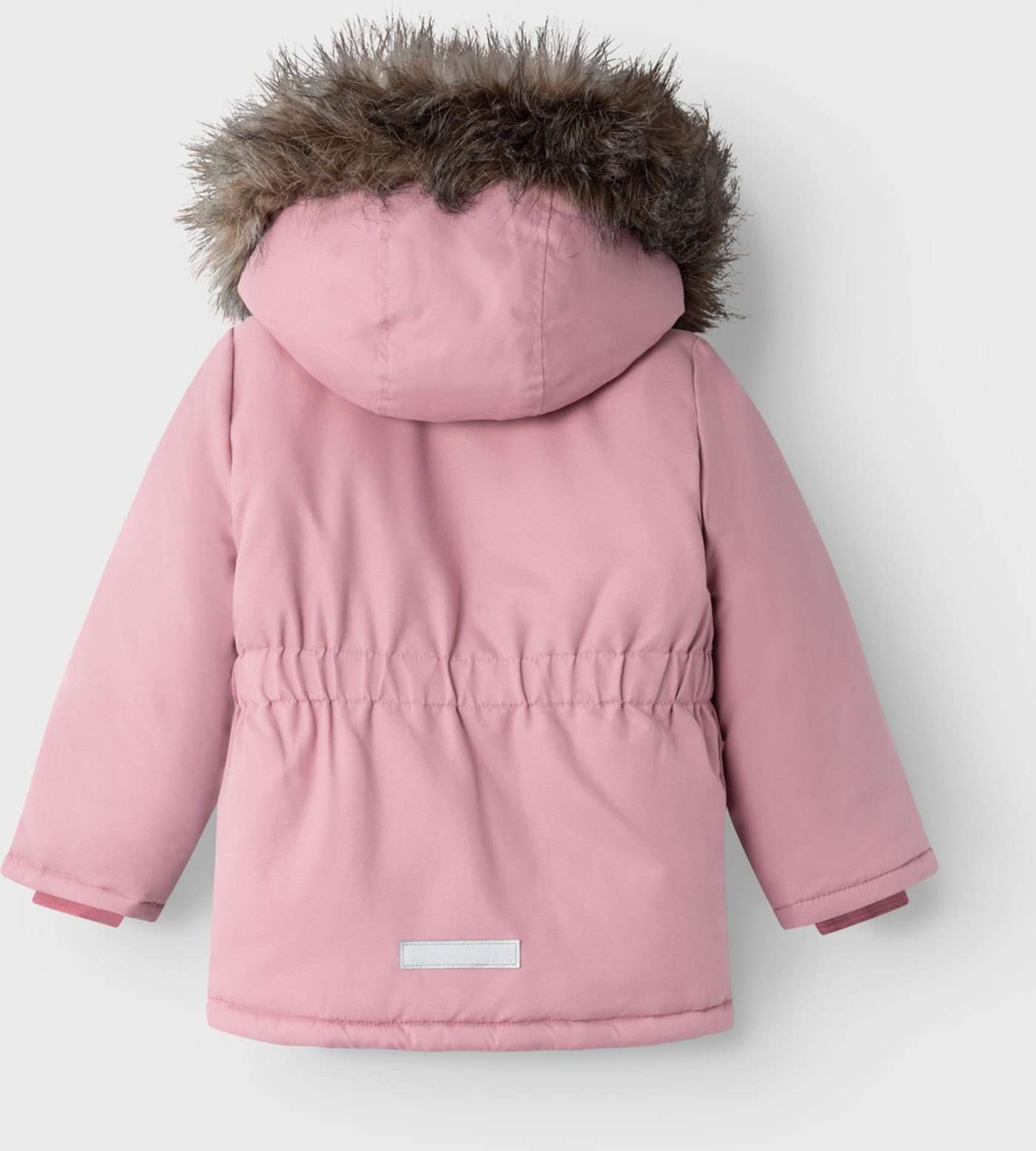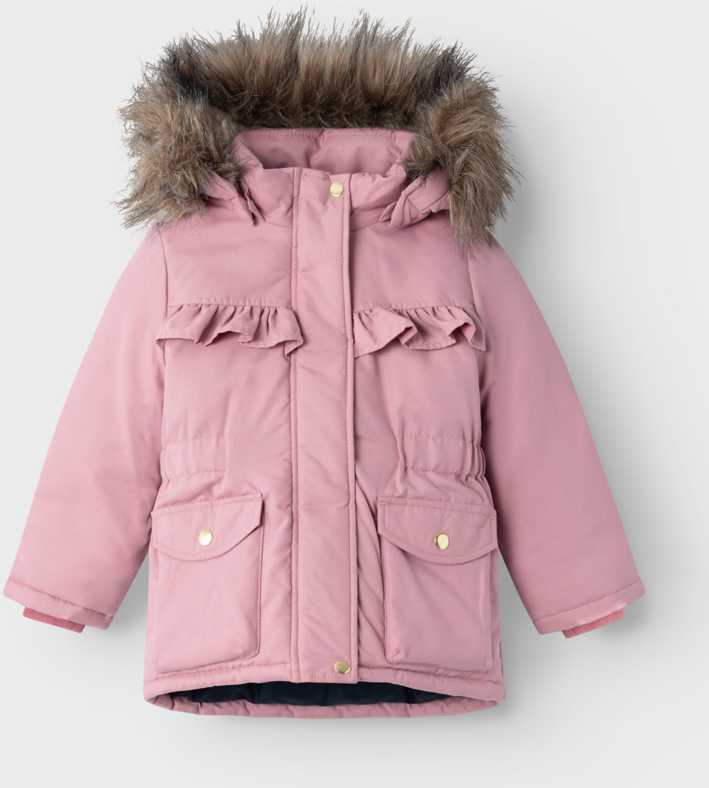 Winter-Parka in einem tollen Rosaton mit abnehmbarer Fell-Kapuze von NAME IT für Mädchen. Der Fellimitat-Besatz der Kapuze ist ebenfalls abknöpfbar. Auf der Vorderseite der Jacke befinden sich zwei aufgesetzte Klappentaschen mit Druckknöpfen. Die Jacke ist wasserabweisend und lässt sich per Reißverschluss mit unterlegtem Windschutz schließen. Reflektierende Details sorgen für eine bessere Sichtbarkeit im Dunkeln. Die weichen Rippbündchen in den Ärmeln lassen keinen Wind hinein. Die wattierte Jacke ist ideal für kalte Tage. Die BIONIC FINISH®ECO Imprägnierung basiert auf einer fluorfreien Rezeptur und hält die Farbe und das Gewebe länger neu.