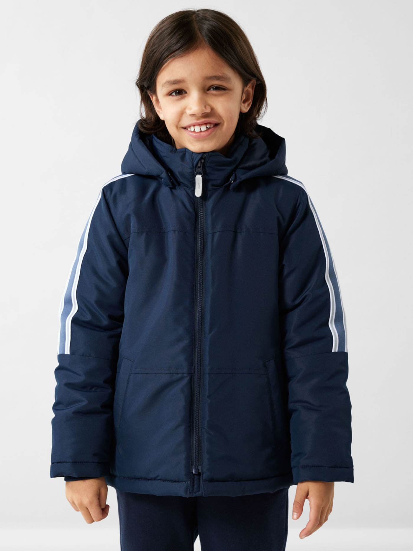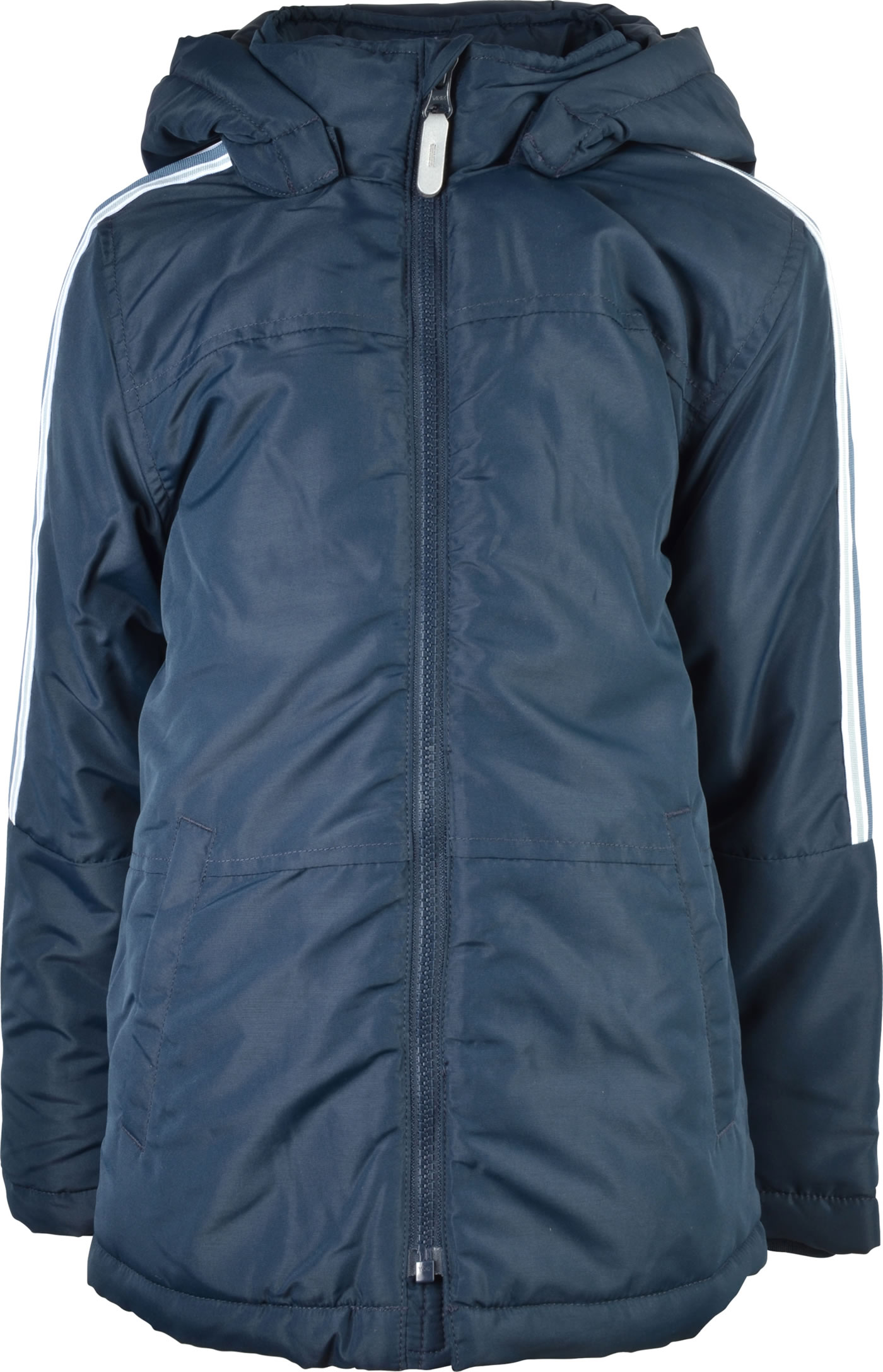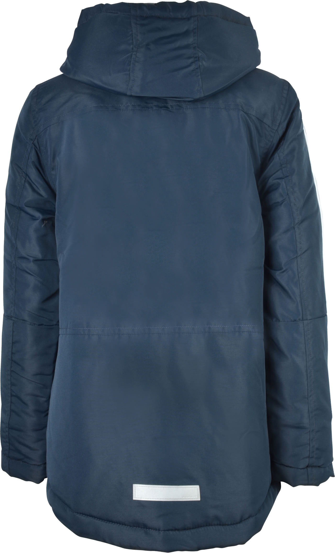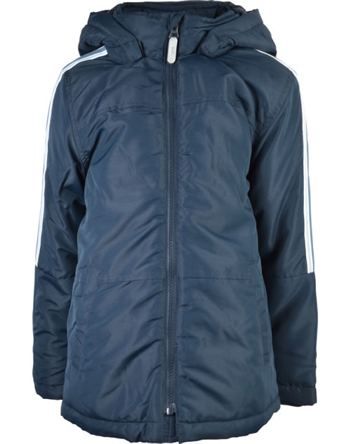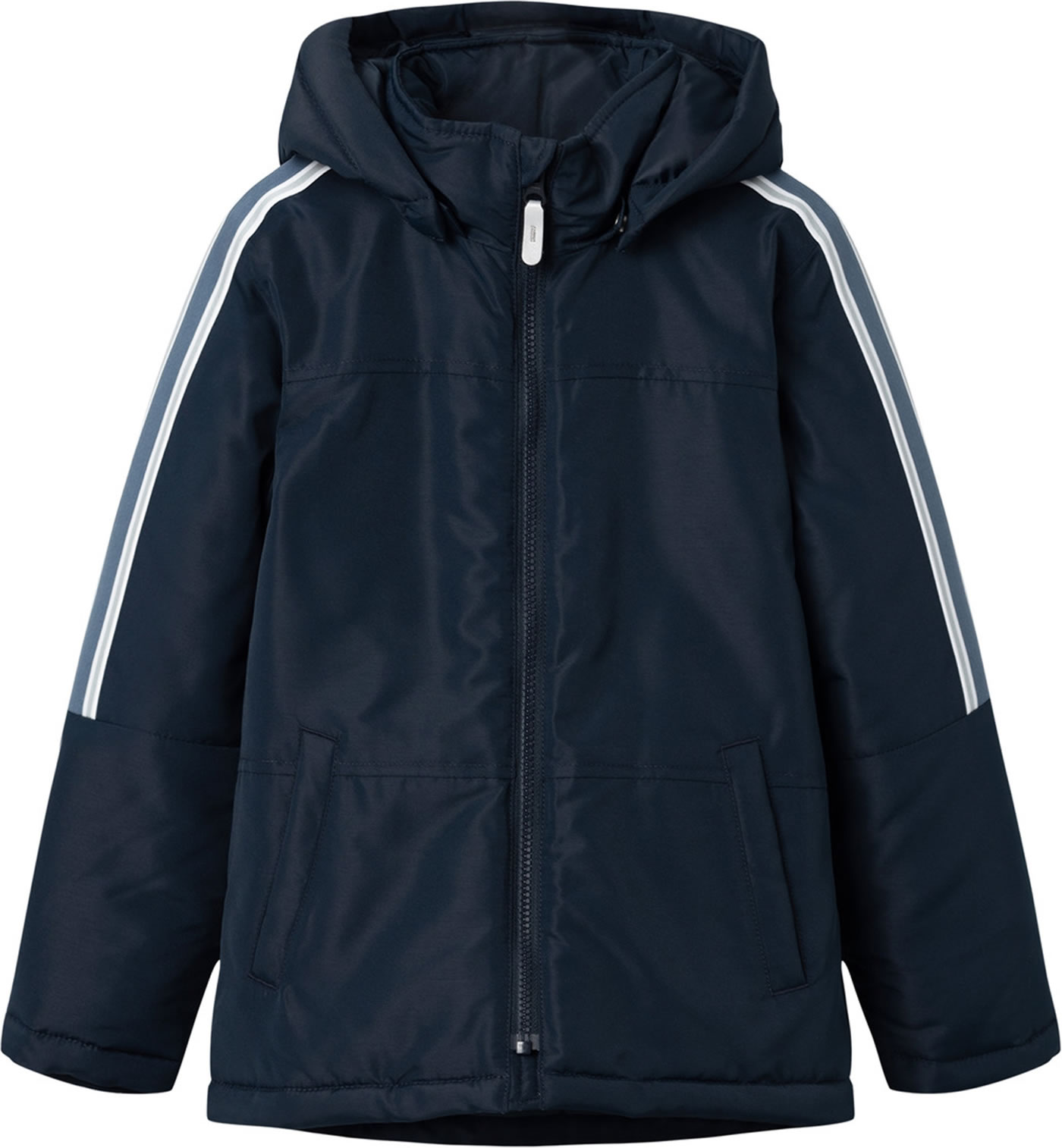Wattierte Jacke mit Kapuze für Jungen von NAME IT. Zwei seitliche Taschen bieten Platz für Kleinigkeiten. Reflektierende Details sorgen für gute Sichtbarkeit an trüben Tagen. Die Kapuze ist abknöpfbar. Am Reißverschluss befindet sich ein Kinnschutz. In den Ärmeln sorgen Ripp-Bündchen für einen guten Sitz. Von der Schulter bis zu den Ellenbogen haben die Ärmel einen Kontraststreifen.