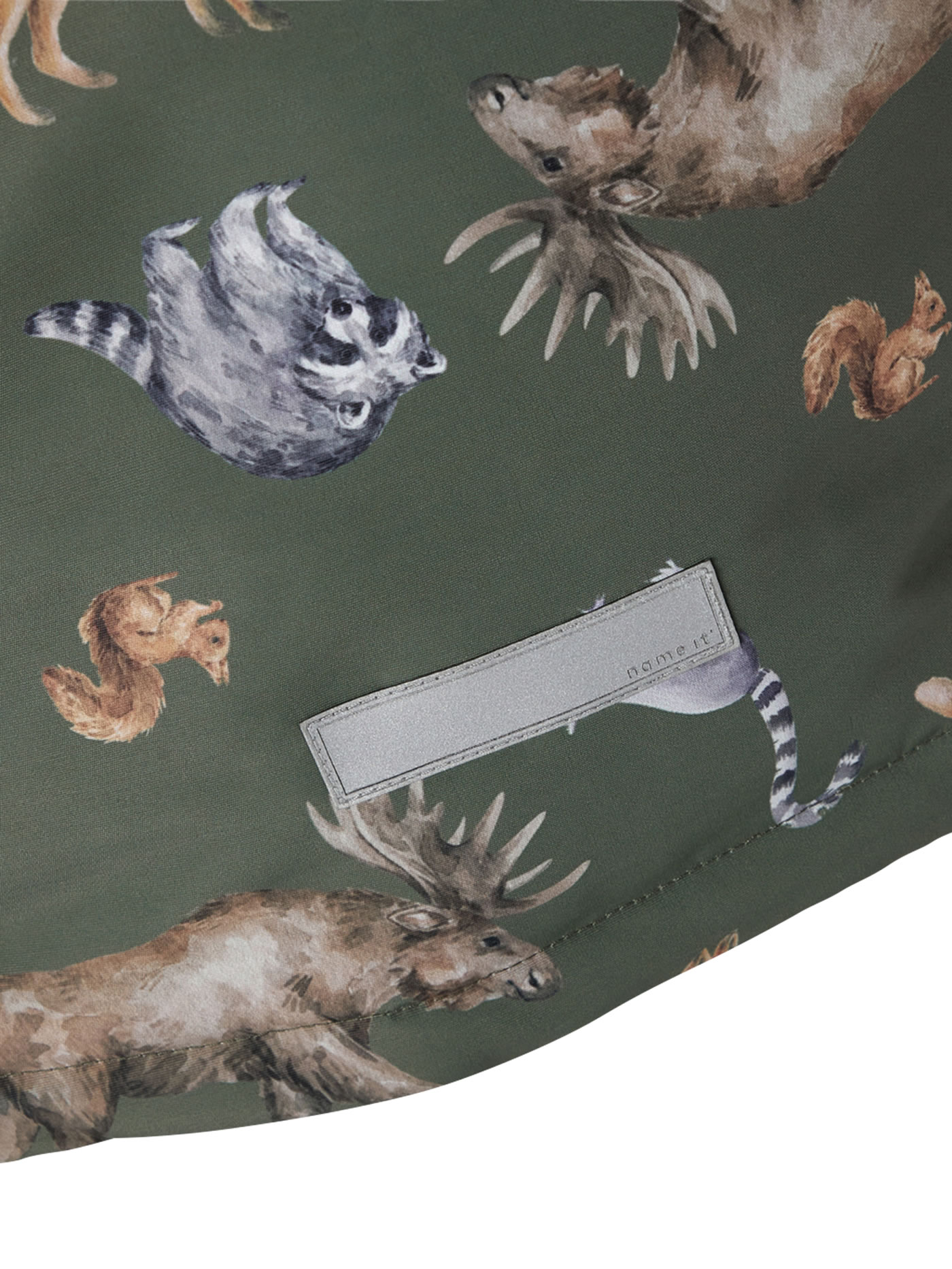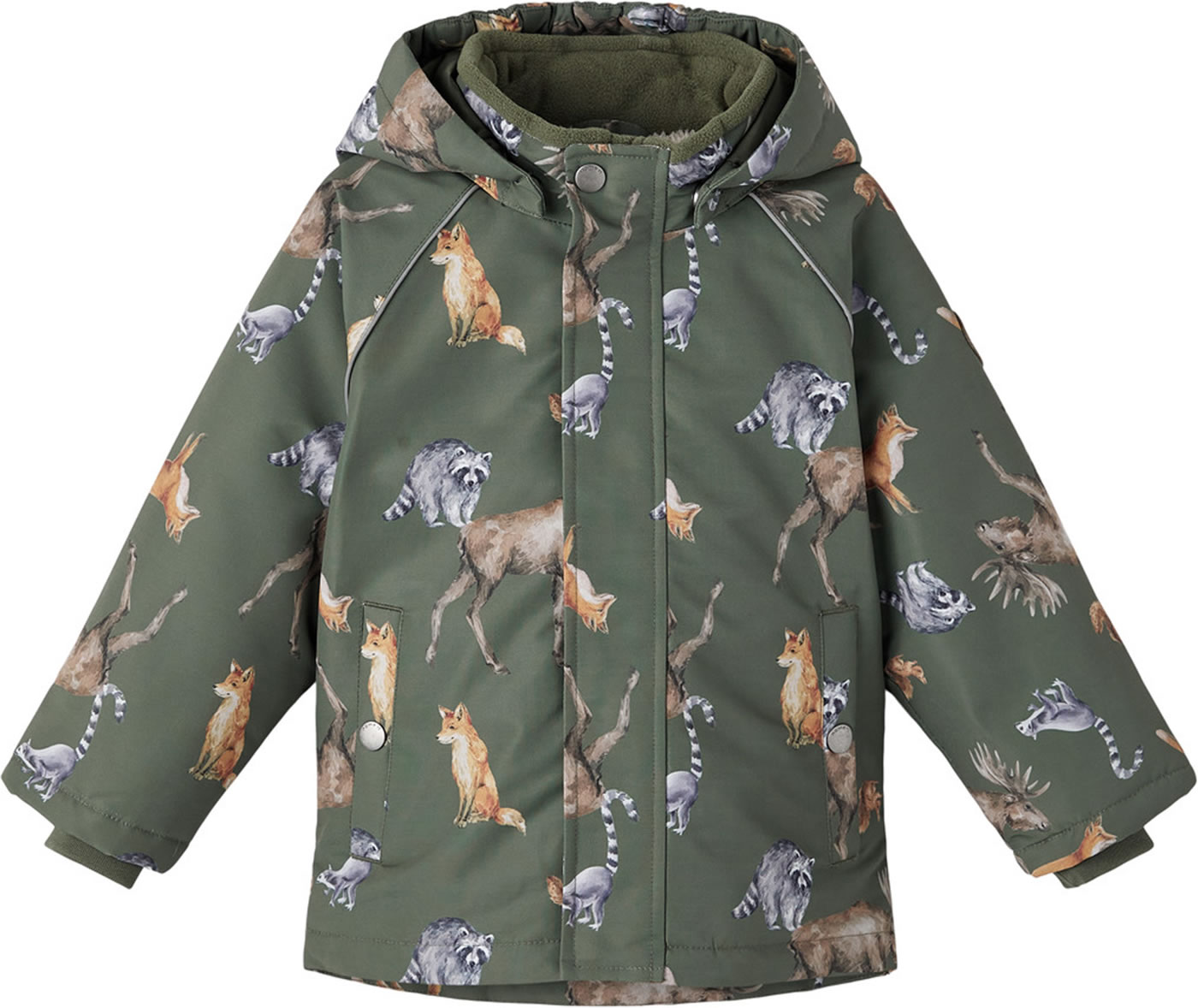 Wattierte Jacke mit Kapuze mit tollem Wildtiermotiv für Jungen von NAME IT. Zwei seitliche Taschen bieten Platz für Kleinigkeiten. Reflektierende Details sorgen für gute Sichtbarkeit an trüben Tagen. Die Kapuze ist abknöpfbar. Am Reißverschluss befindet sich ein Kinnschutz. In den Ärmeln sorgen Ripp-Bündchen für einen guten Sitz. Das Teddyplüsch-Futter an Oberkörper ist besonders kuschelig. Die Bionic-Finish ECO Imprägnierung basiert auf einer fluorfreien Rezeptur und hält die Farbe und das Gewebe länger neu.