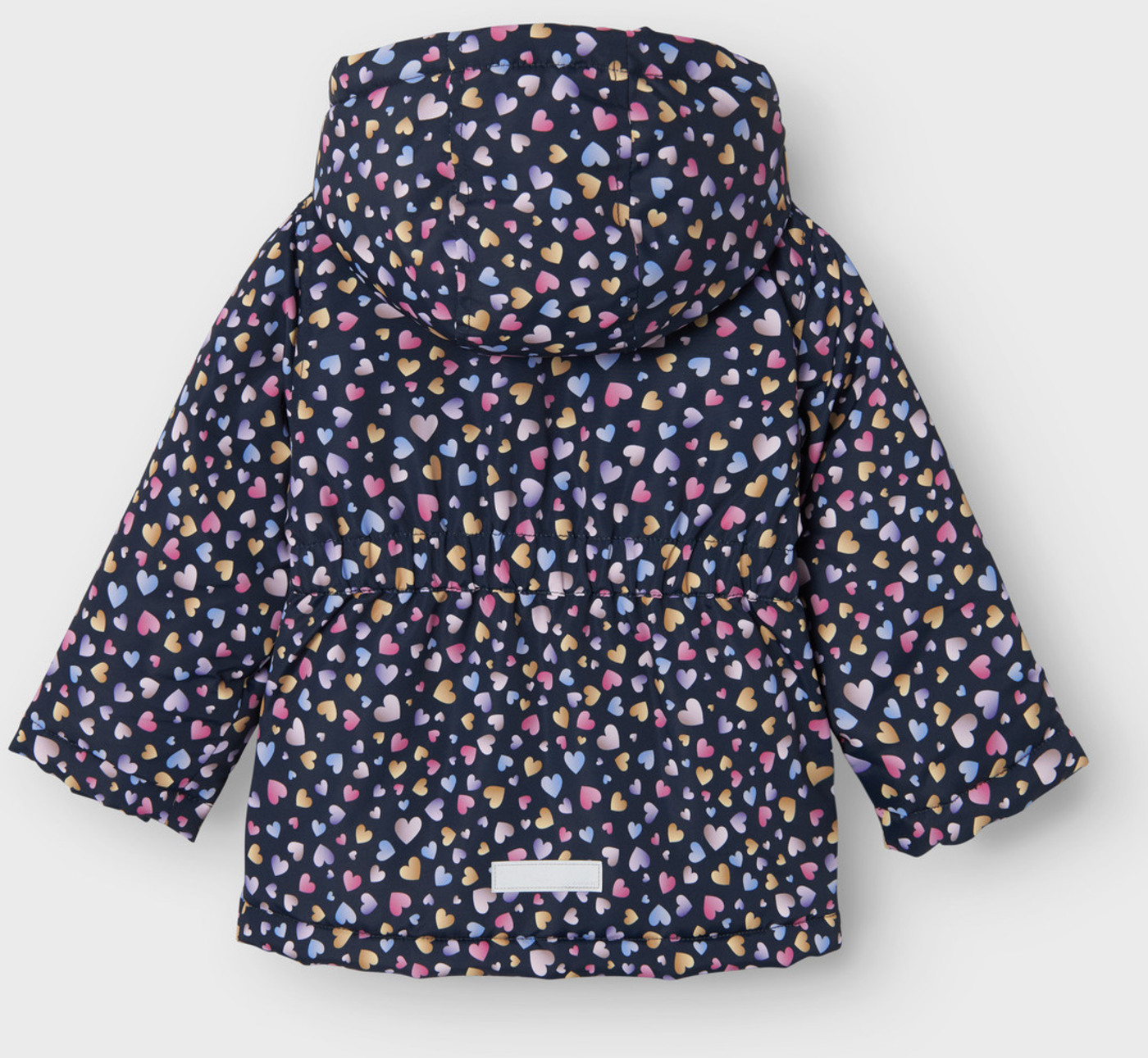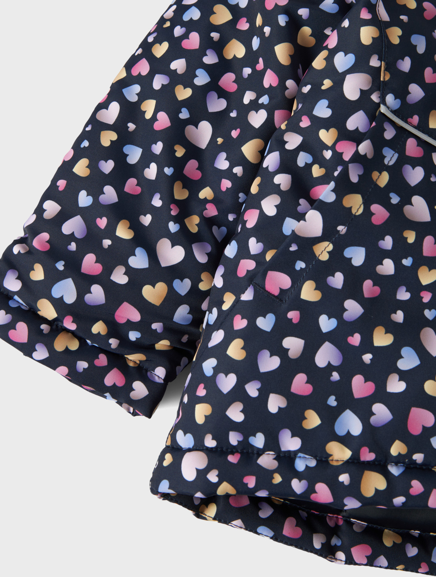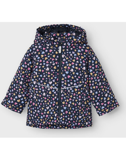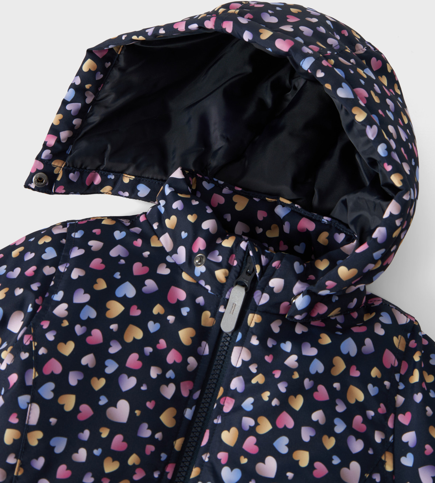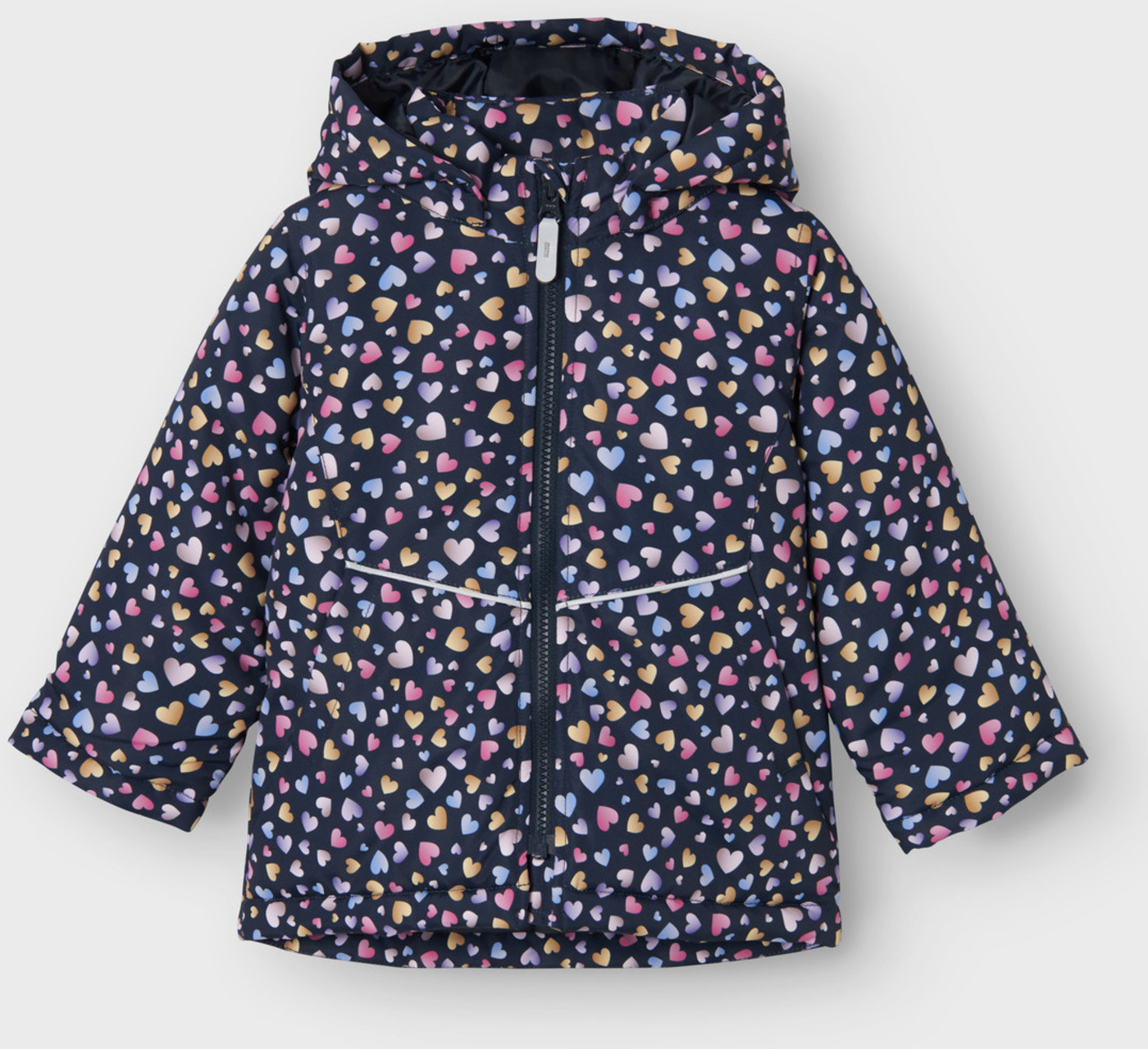 Wattierte Jacke mit Kapuze mit tollem Herzmotiv für Mädchen von NAME IT. Zwei seitliche Taschen bieten Platz für Kleinigkeiten. Reflektierende Details sorgen für gute Sichtbarkeit an trüben Tagen. Die Kapuze ist abnehmbar. Am Reißverschluss befindet sich ein Kinnschutz. In den Ärmeln sorgen Ripp-Bündchen für einen guten Sitz. Im Rückenteil ist die Jacke leicht gerafft. Die Bionic-Finish ECO Imprägnierung basiert auf einer fluorfreien Rezeptur und hält die Farbe und das Gewebe länger neu.