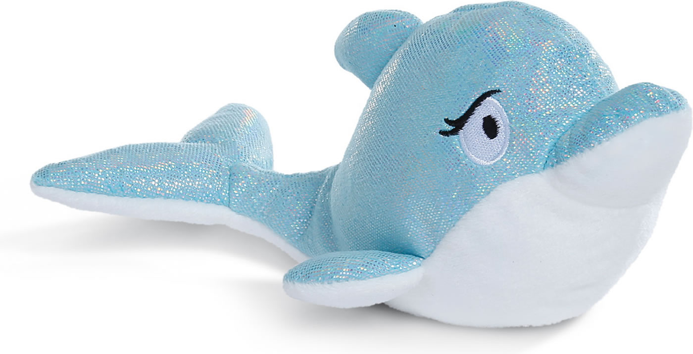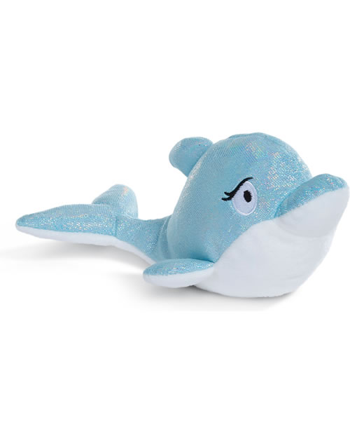 Die Unterseite des Delfins ist kuschelweich und die Oberseite schimmert in hellblau.