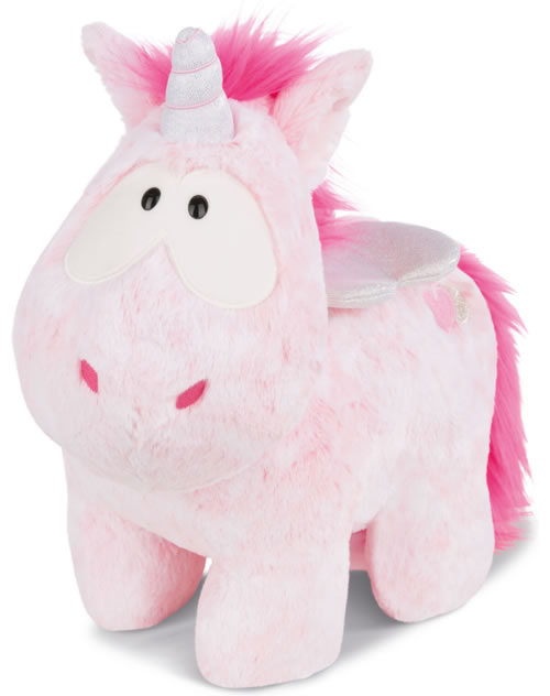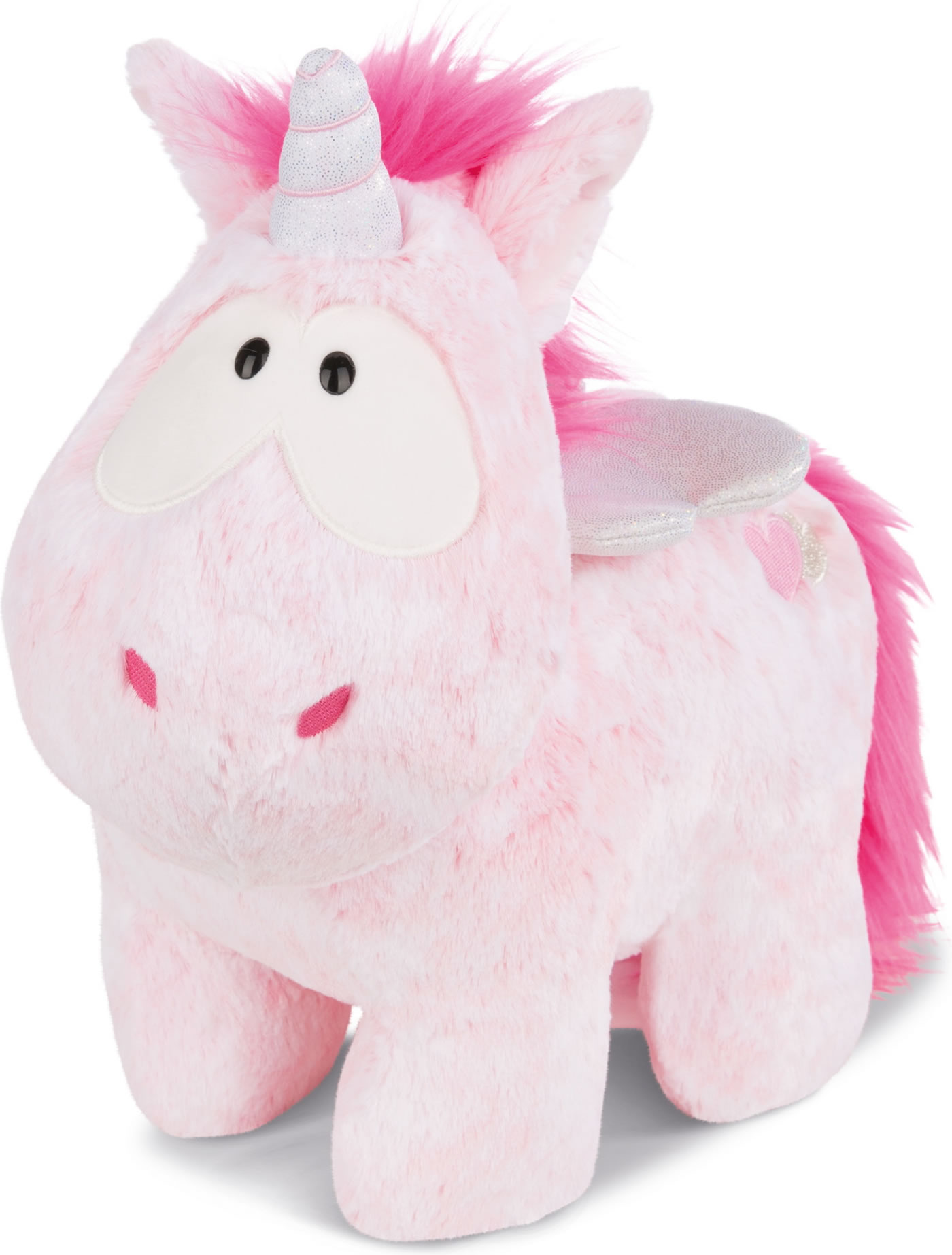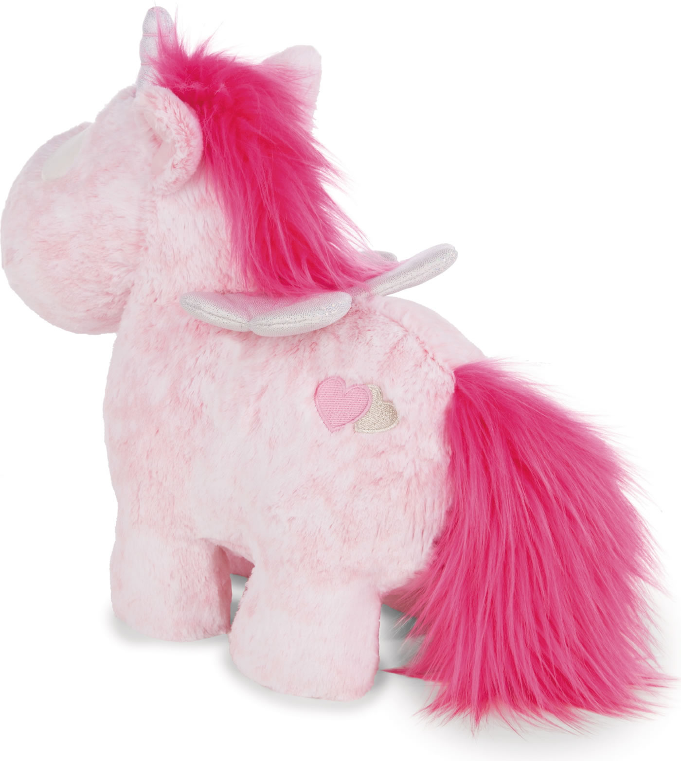 Das Einhorn Pink Harmony hat silbern schimmernde Herz-Flügel, pinkfarbene Mähne und Schweif und auf seimem Rücken befindet sich eine Herz-Applikation.