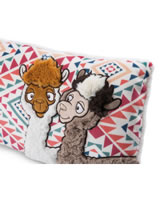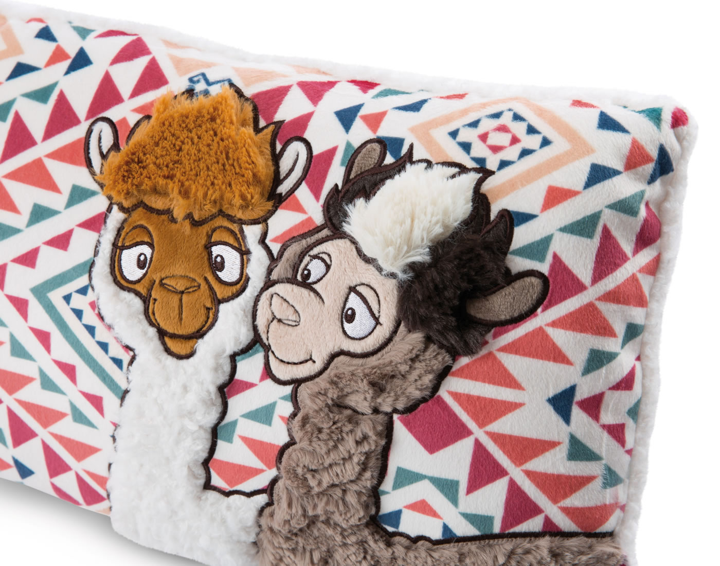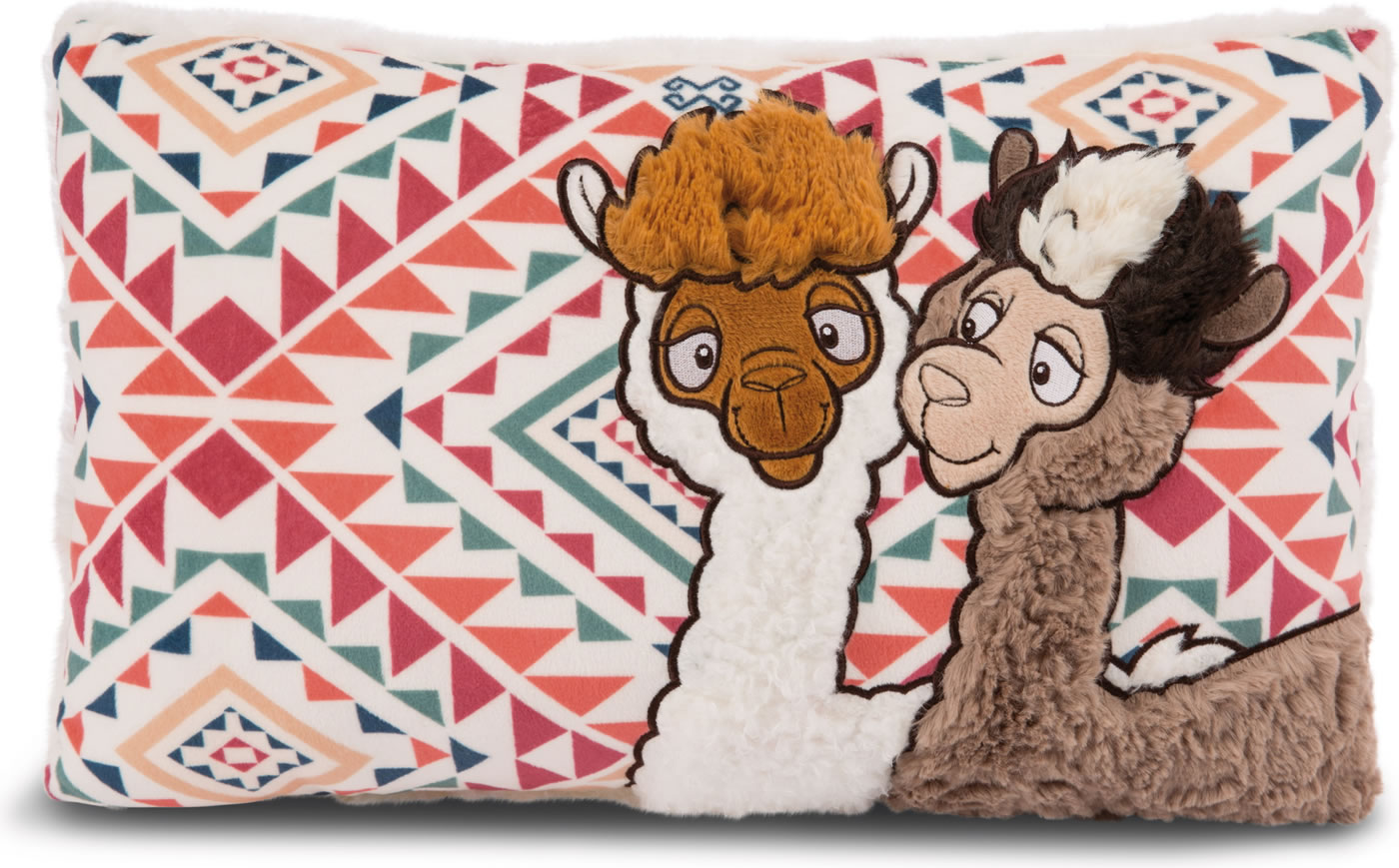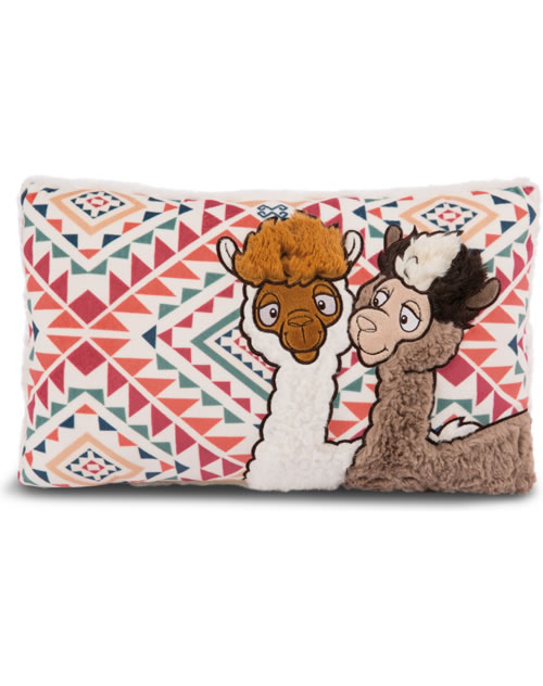 Die Alpakas Sue und Joe laden mit ihrem flauschigen Fell zum Kuscheln ein. Das Kissen mit Indio-Muster ist ein toller Hingucker auf Sofa oder Bett.