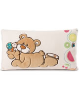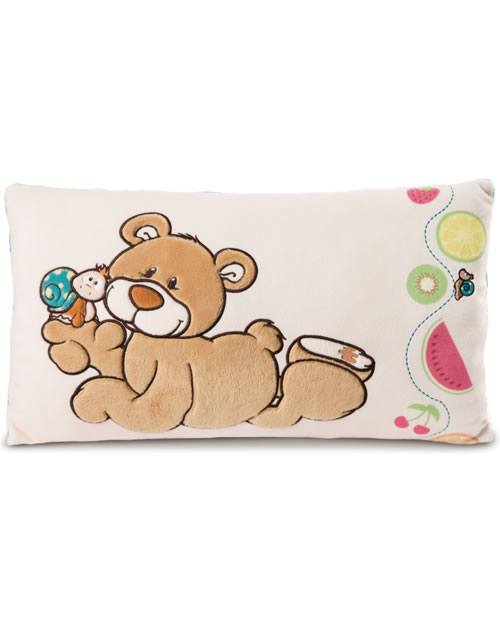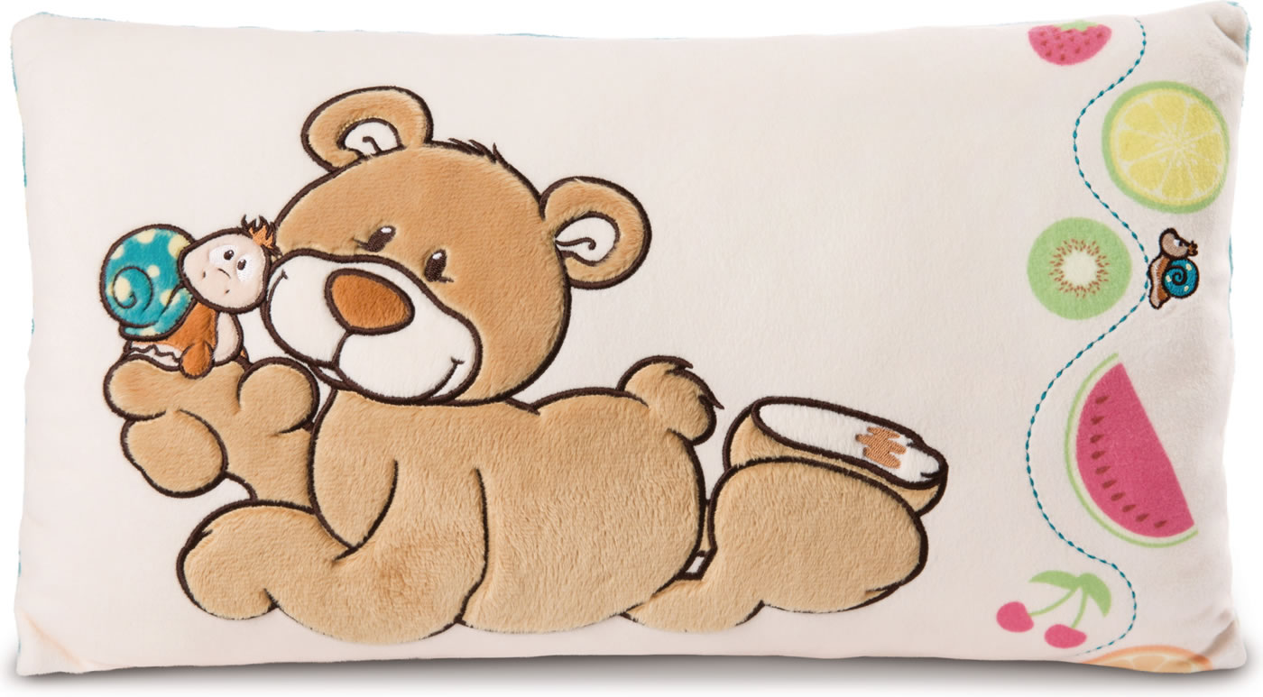 Ob auf dem Sofa, im Bett oder auf der Reise im Auto. Das kuschelige Kissen mit dem Bären und der Schnecke hilft beim Einschlafen und Entspannen.