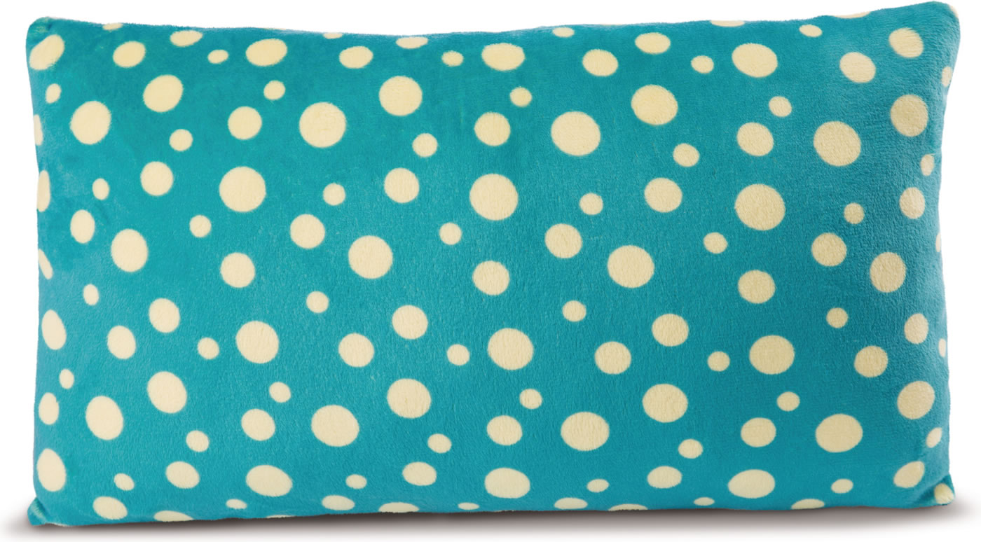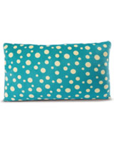 Vorn hat das Kissen aufwendige Stickapplikationen und die Rückseite ist mit lustigen Punkten übersät.