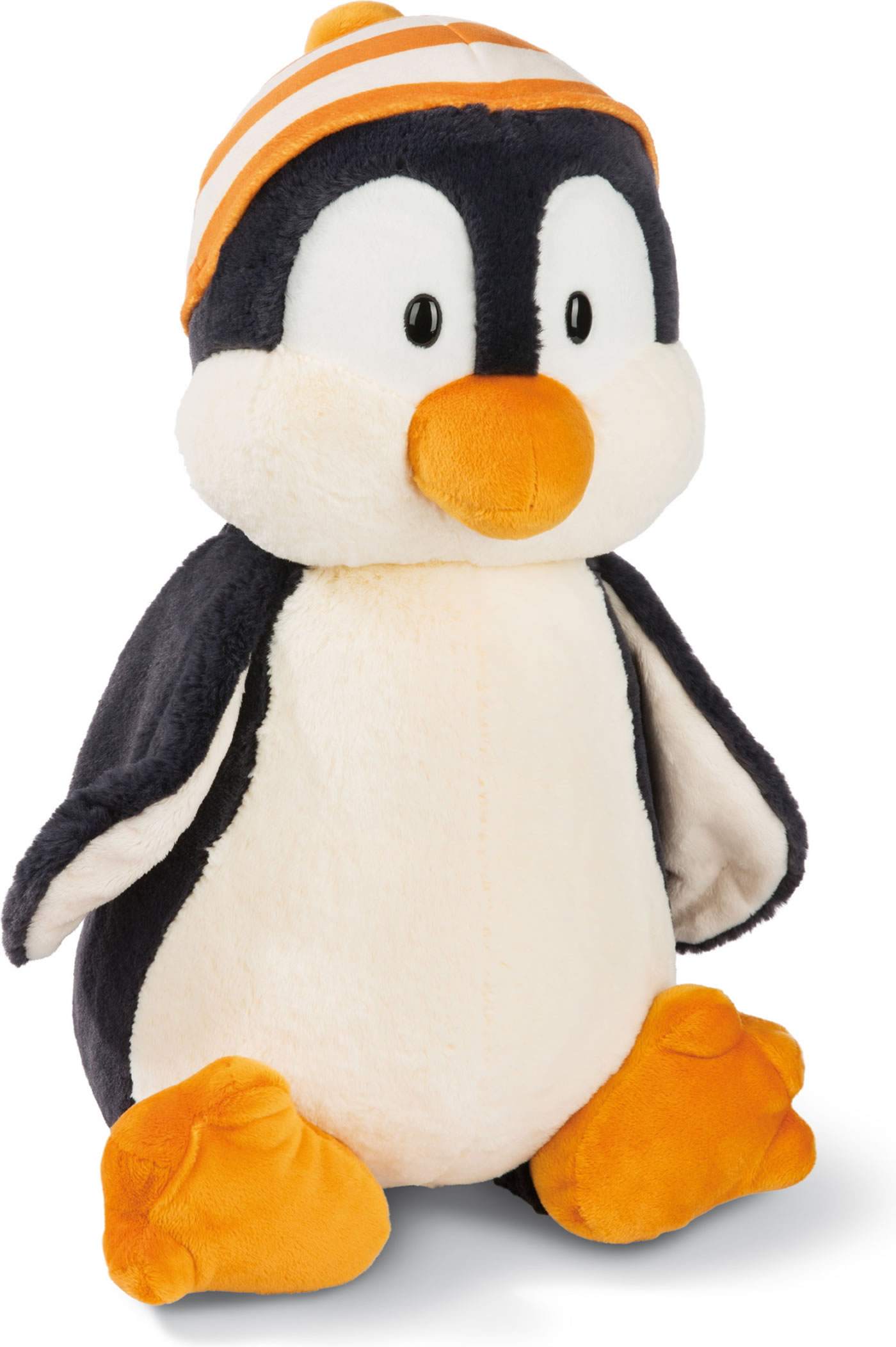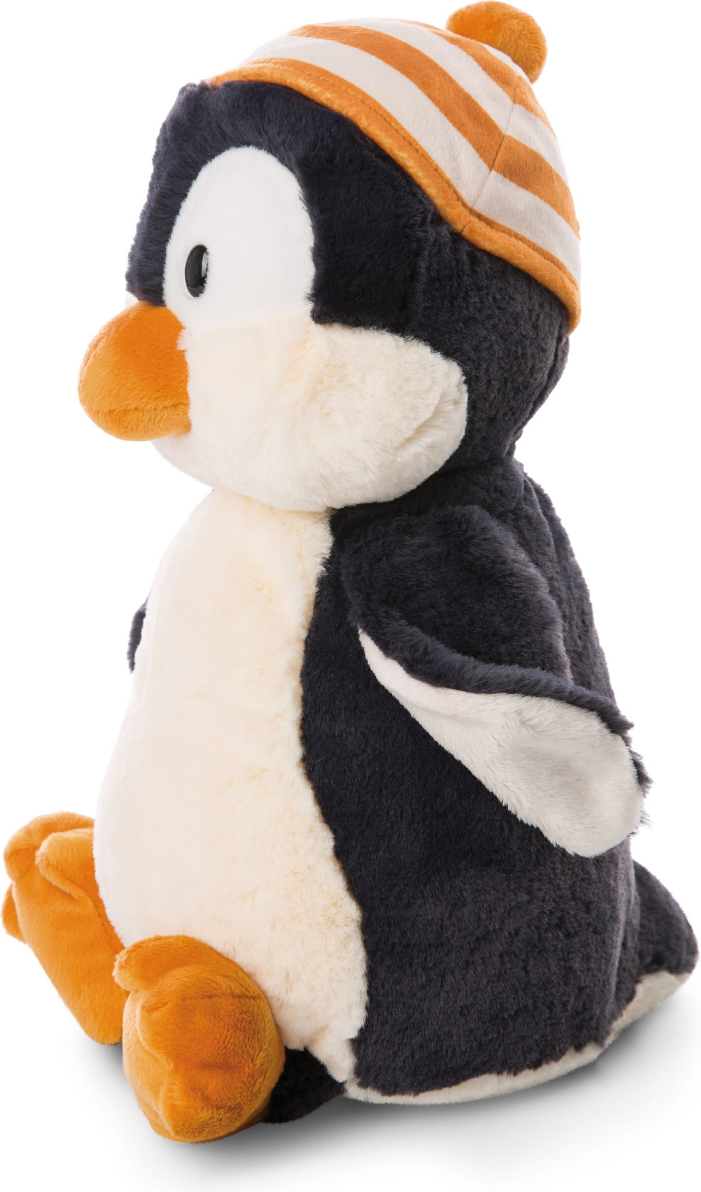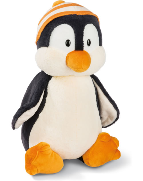 Pinguin Peppi hat kuschelig weiches Fell und seine orange geringelte Mütze passt perfekt zu den orangen Füßen.