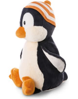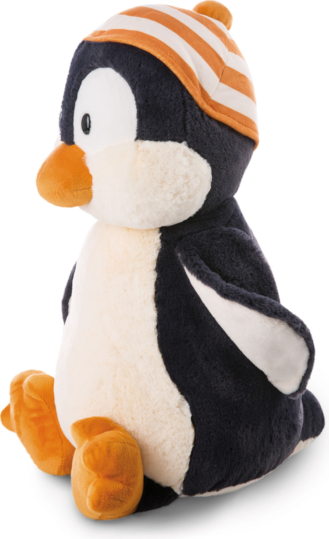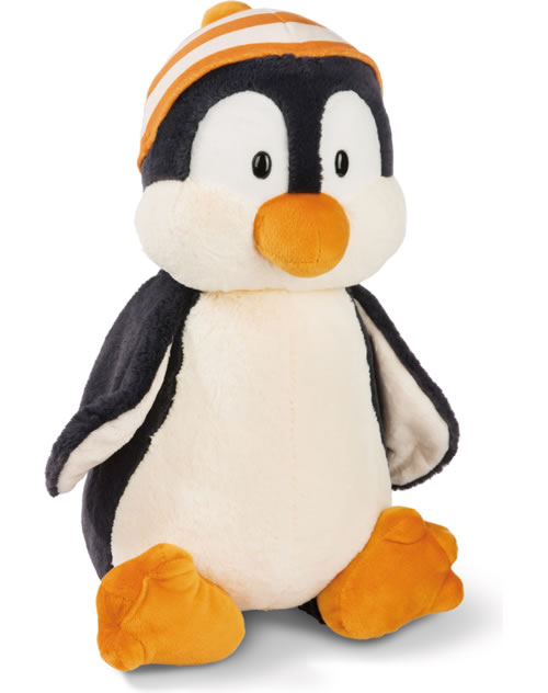 Pinguin Peppi hat kuschelig weiches Fell und seine orange geringelte Mütze passt perfekt zu den orangen Füßen.