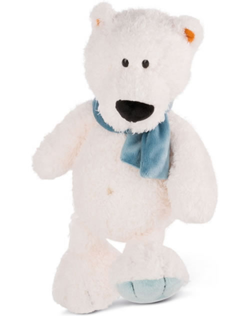 Eisbär Bignic kommt vom Nordpol und und hat flauschig weiches Fell, um sich gegen die Kälte dort zu schützen. Aber er braucht auch noch seinen blauen Nicki-Schal, um den Hals zu wärmen.