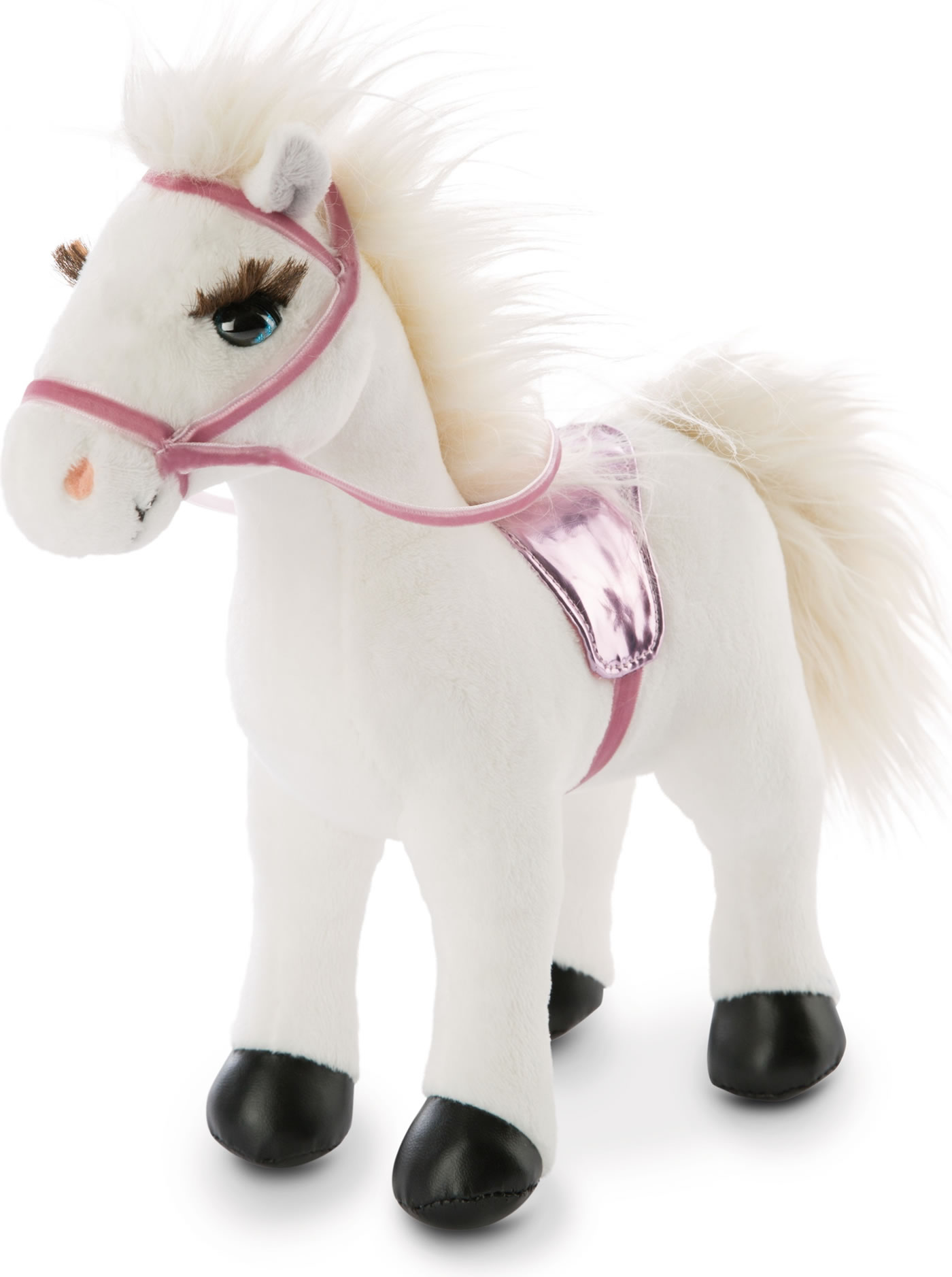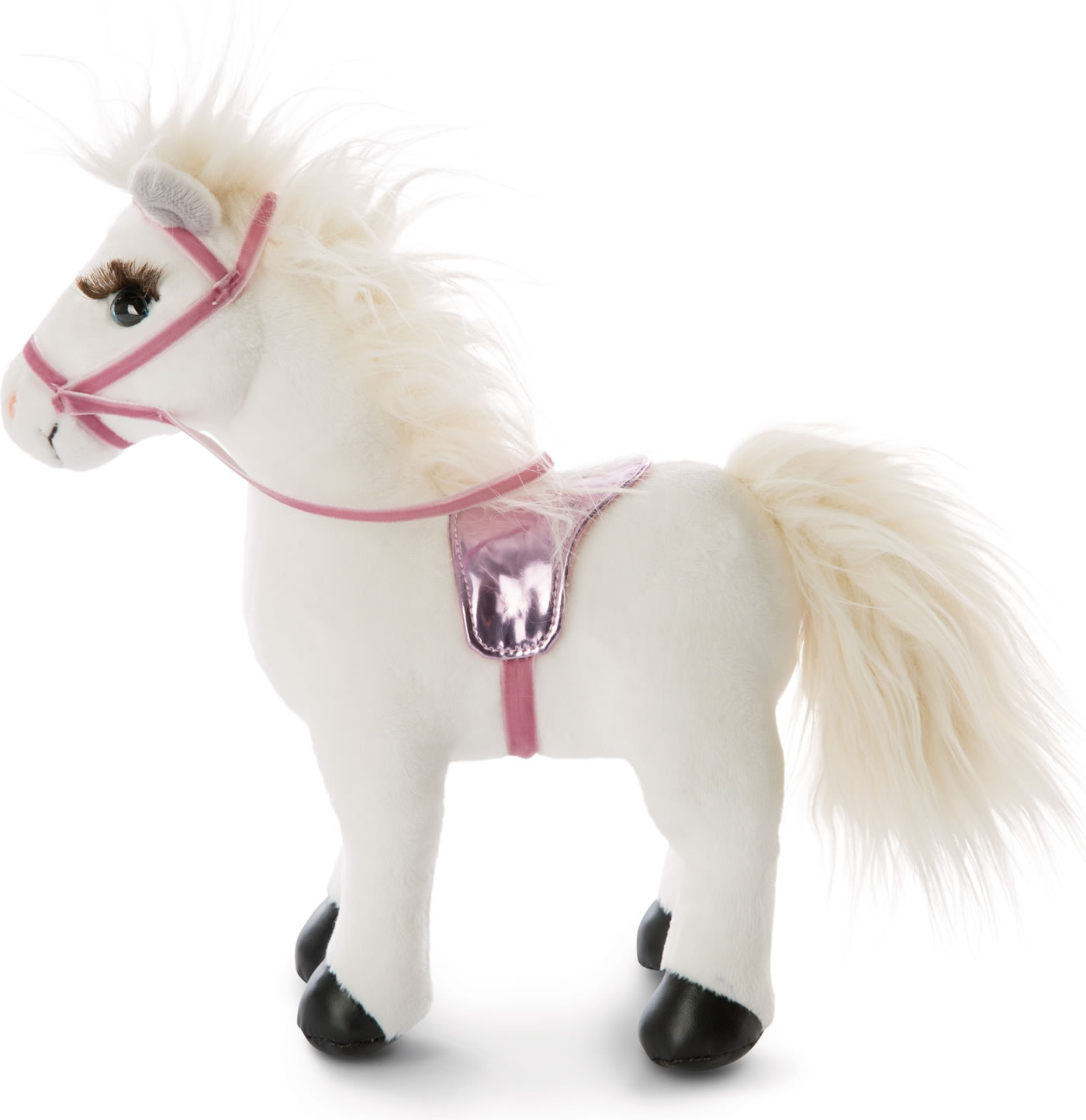 Pferd Winnie ist mit Zaumzeug und glitzerndem Sattel ausgestattet. Mit seinem weichen Fell und den großen blauen Augen lädt es zum Kuscheln und Spielen ein.