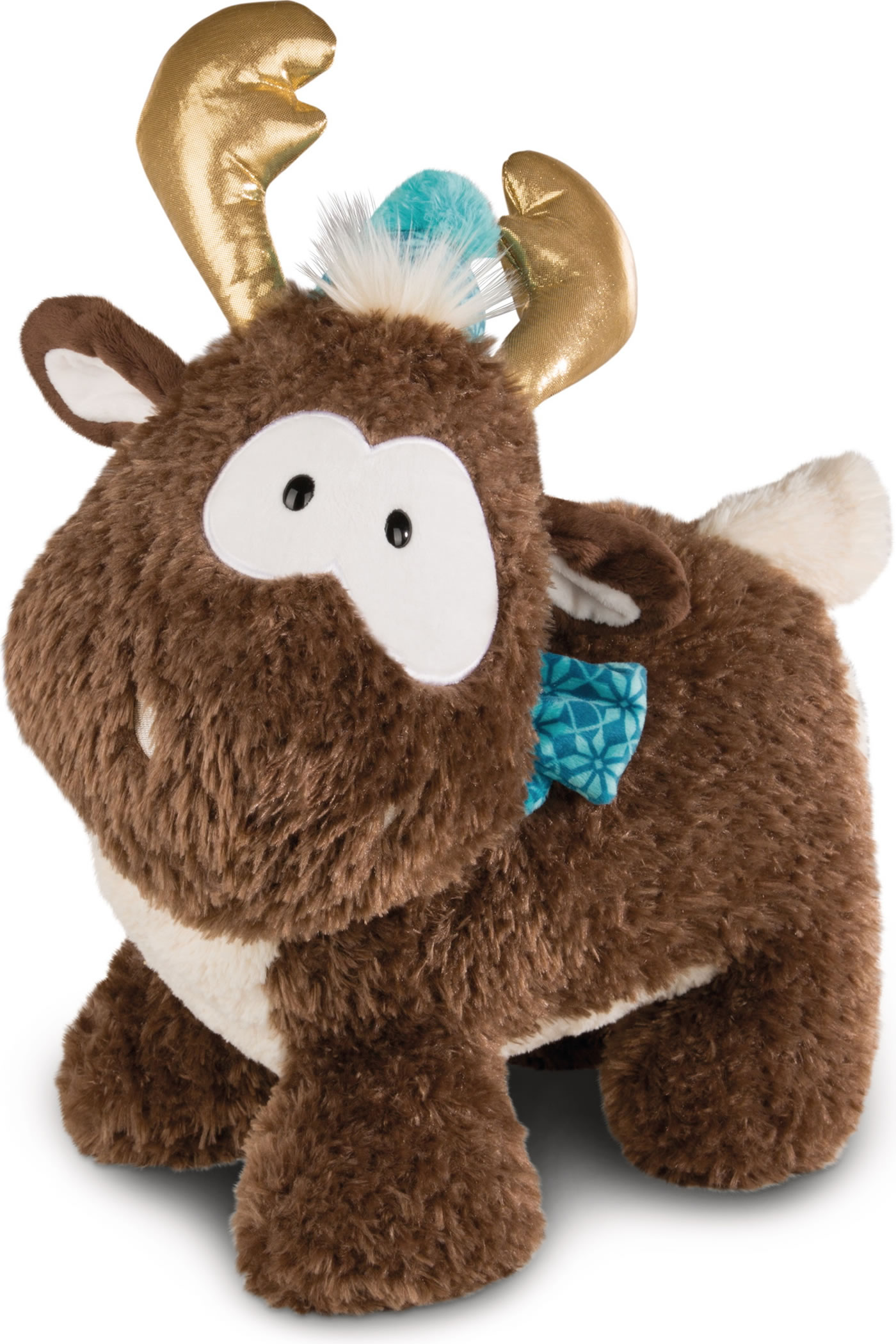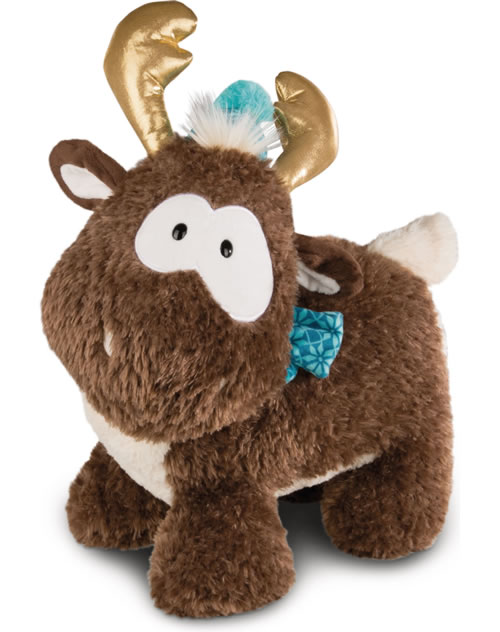 Rentier Reny Heart hat zotteliges Fell und ist kuschelig weich. Gegen die Kälte hat er eine kleine Mütze auf dem Kopf und einen Schal um den Hals. Sein Geweih ist goldfarben.