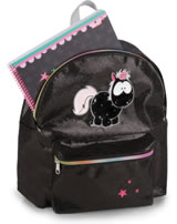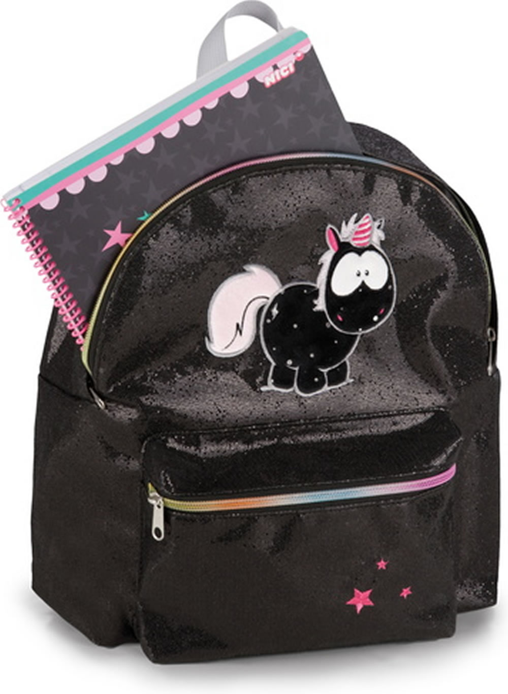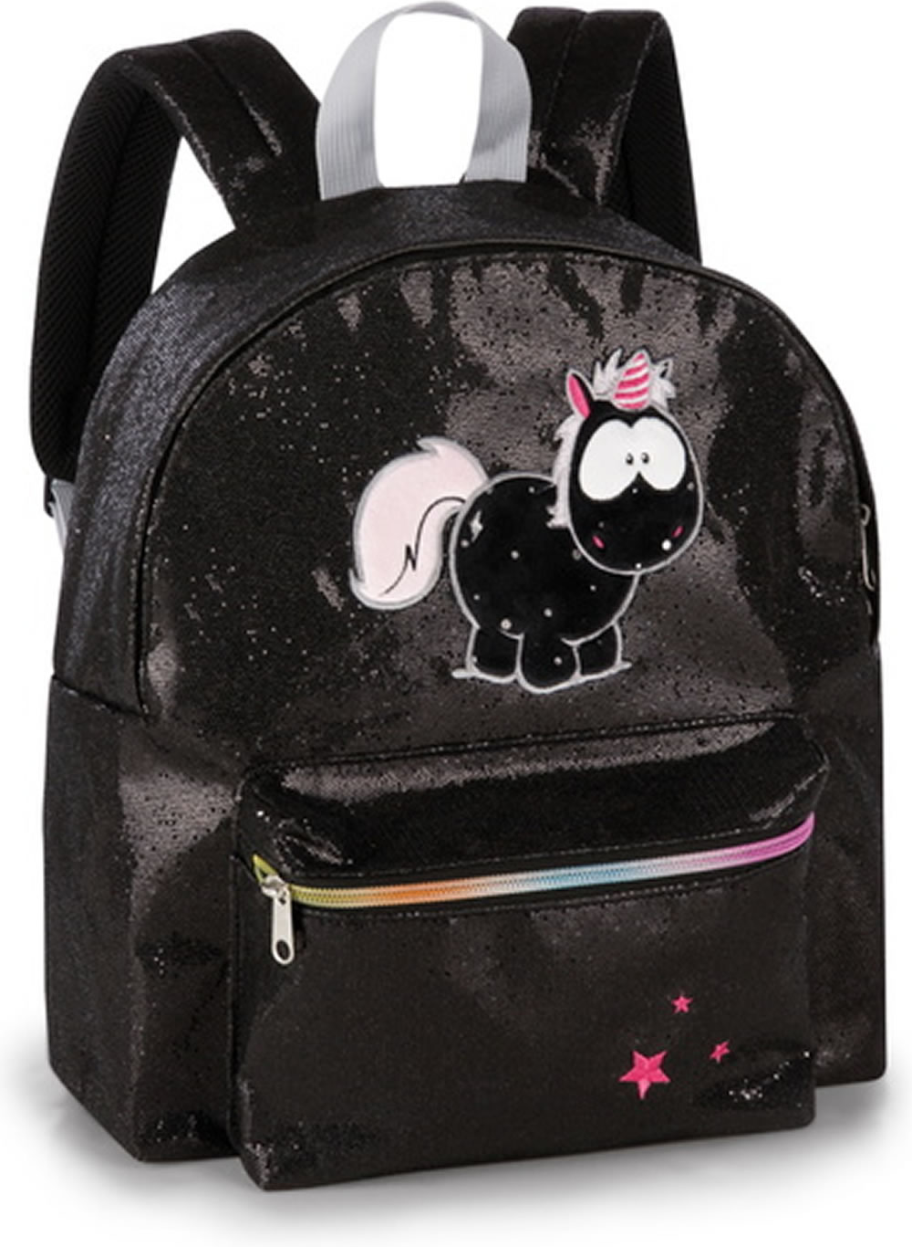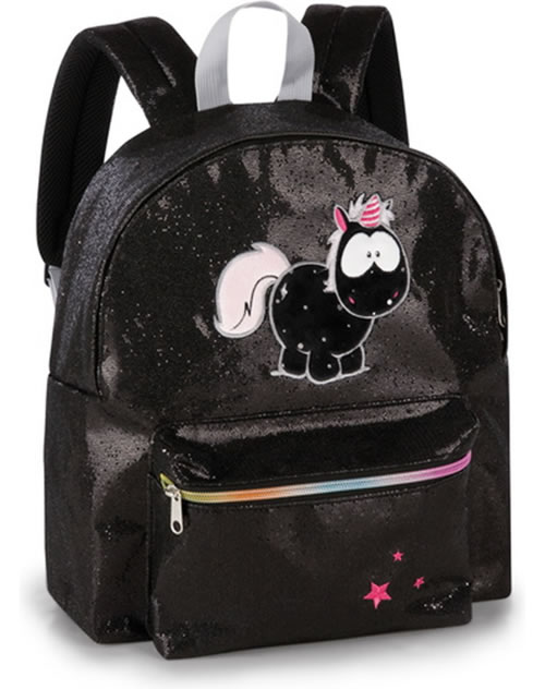 Der schwarze Rucksack ist aus glitzerndem Material. Die Reißverschlüsse schimmern in den Farben des Regenbogens. Vorn befindet sich eine Applikation mit dem kleinen Einhorn Carbon Flash.