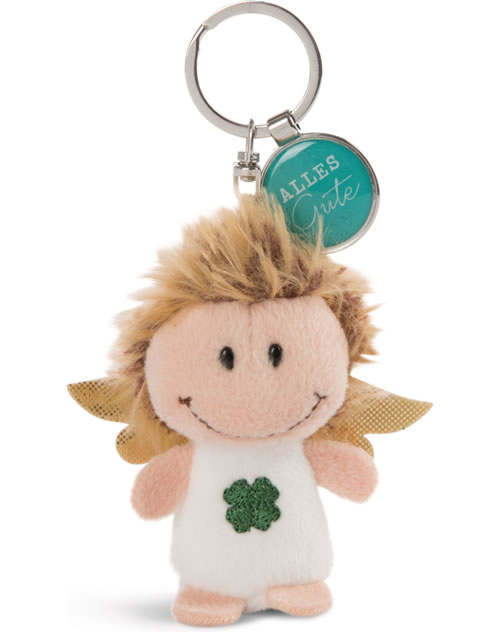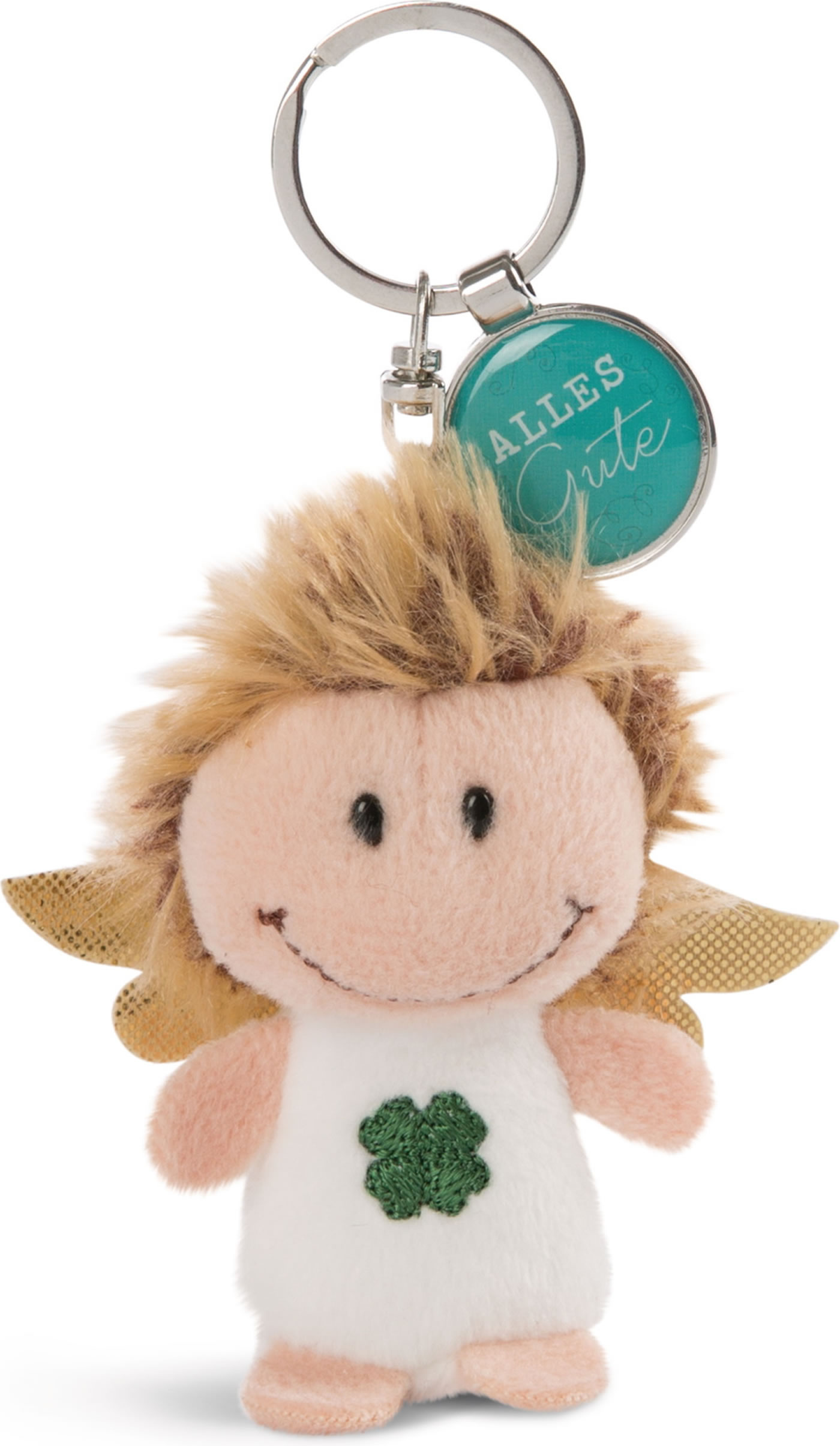 Der kleine Schutzengel aus Plüsch hat goldene Flügel und eine Botschaft für Dich. Der Schlüsselanhänger kann Rucksäcke, Taschen und das Schlüsselbund verzieren und der kleine Emaille-Anhänger hat die Botschaft "Alles Gute".