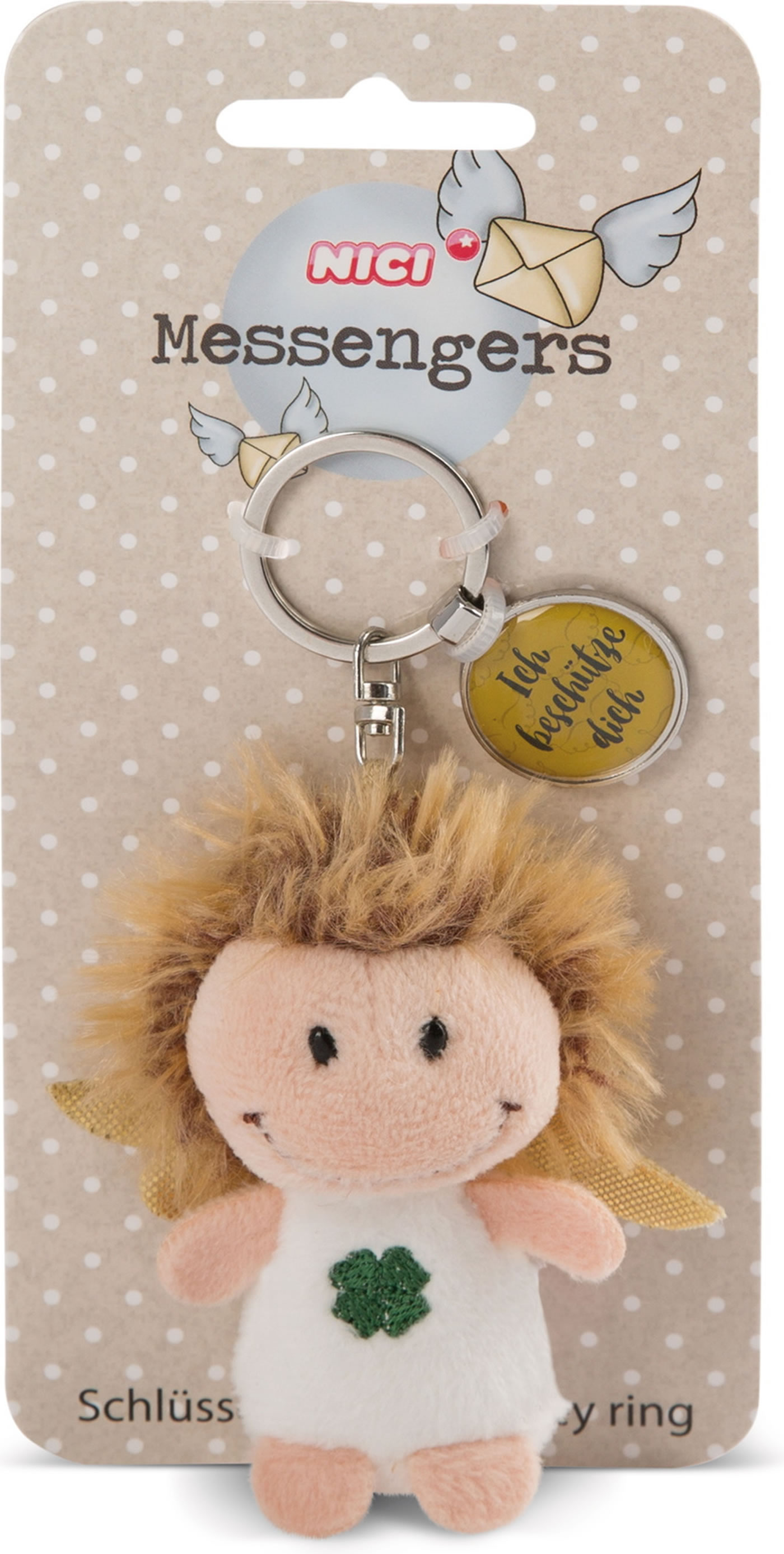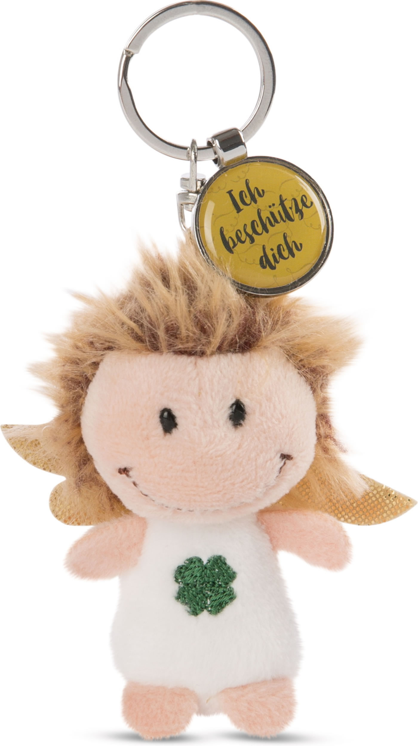 Der kleine Schutzengel aus Plüsch hat goldene Flügel und eine Botschaft für Dich. Der Schlüsselanhänger kann Rucksäcke, Taschen und das Schlüsselbund verzieren und der kleine Emaille-Anhänger hat die Botschaft "Ich beschütze dich".