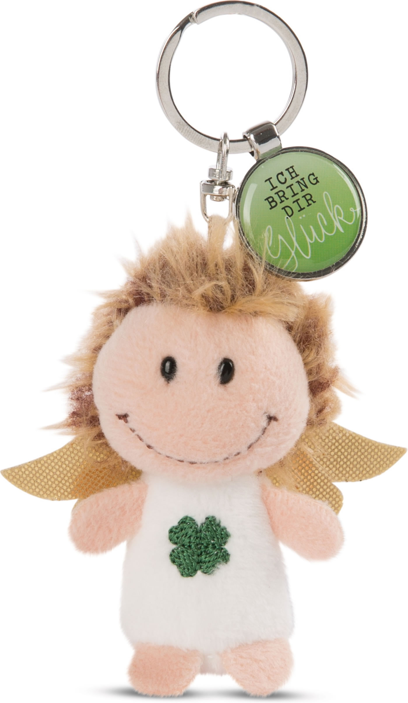 Der kleine Schutzengel aus Plüsch hat goldene Flügel und eine Botschaft für Dich. Der Schlüsselanhänger kann Rucksäcke, Taschen und das Schlüsselbund verzieren und der kleine Emaille-Anhänger hat die Botschaft "Ich bringe dir Glück".