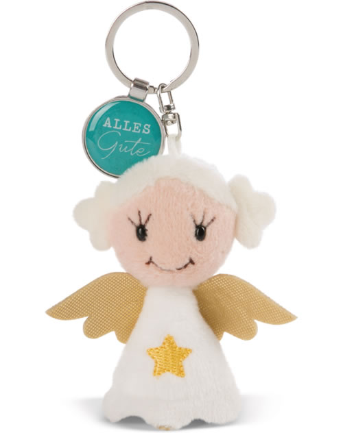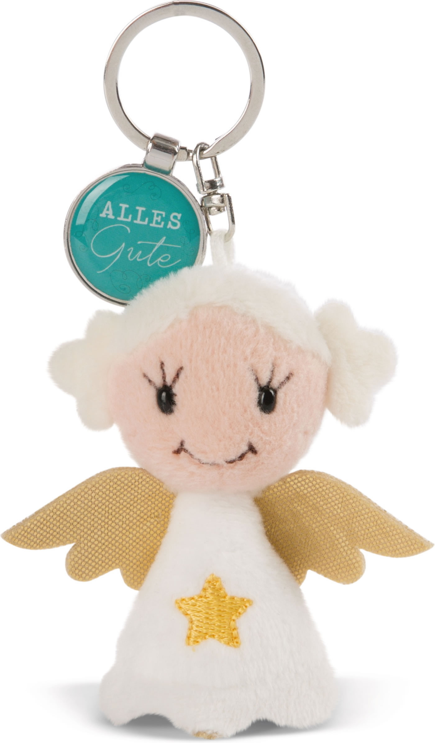 Der kleine Schutzengel aus Plüsch hat goldene Flügel und eine Botschaft für Dich. Der Schlüsselanhänger kann Rucksäcke, Taschen und das Schlüsselbund verzieren und der kleine Emaille-Anhänger hat die Botschaft "Alles Gute".