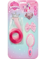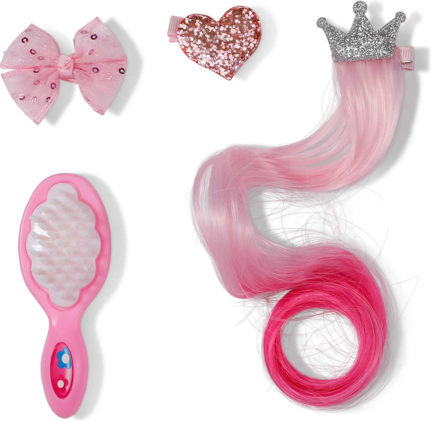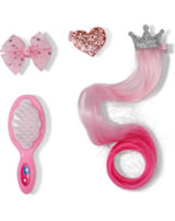 Die beiden Haarspangen und die farbige Haarsträhne mit Krone sorgen für noch mehr Glamour im Haar-Styling. Natürlich braucht man für kreative Frisurenauch eine hübsche Haarbürste.