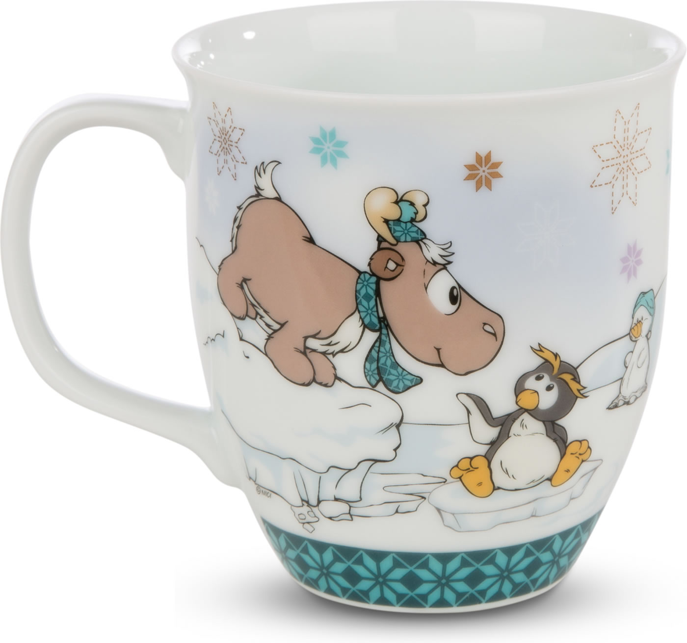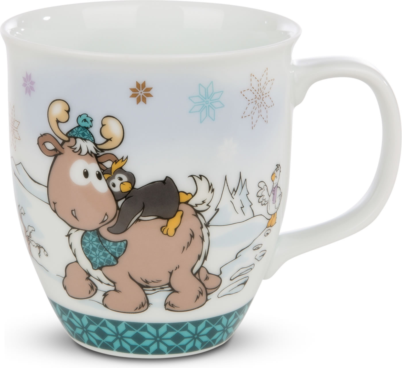 Witzige bunte Tasse mit dem Rentier Reny Heart und Pinguin Frizzy.