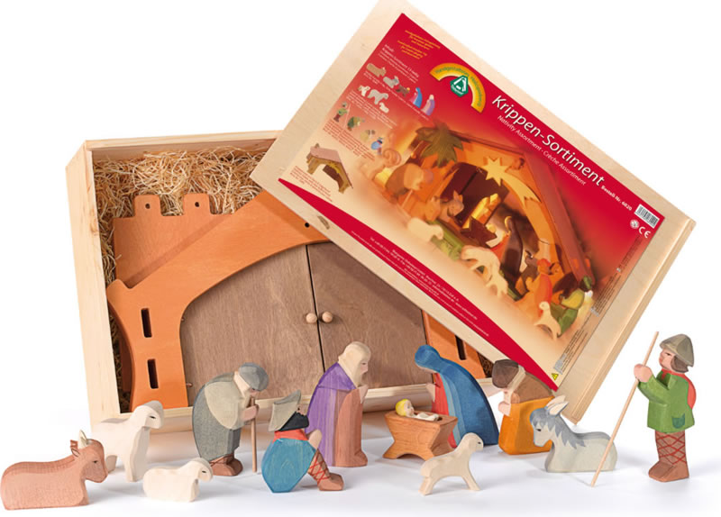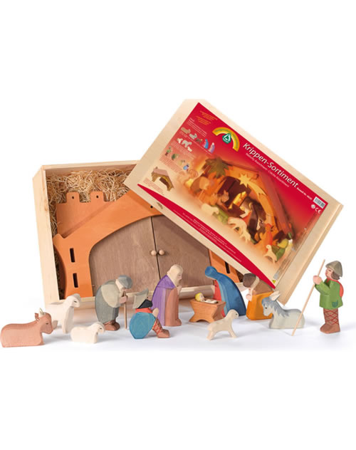 Wunderschönes Krippen-Sortiment mit Stall, der Heiligen Familie, Hirten und Tieren.
