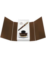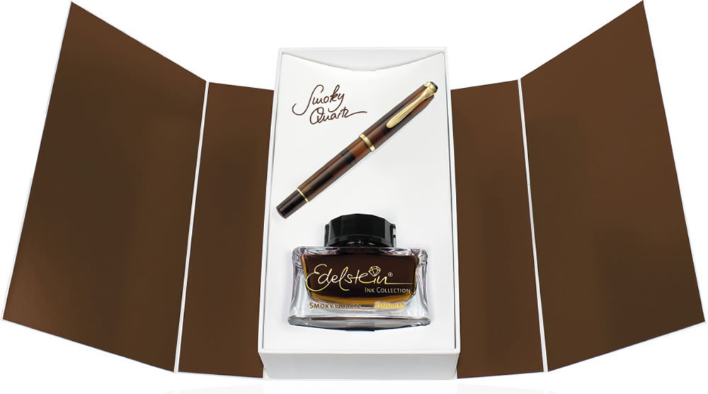 Das Set bestehend aus dem M200 Kolbenfüllhalter zusammen mit der Edelstein Ink des Jahres 2017 Smoky Quartz hält noch eine ganz besondere Rafinesse bereit: nur für das Set wurde auch der Flakon der Edelstein Ink Tinte mit goldener Schrift veredelt. Einfach fabelhaft!