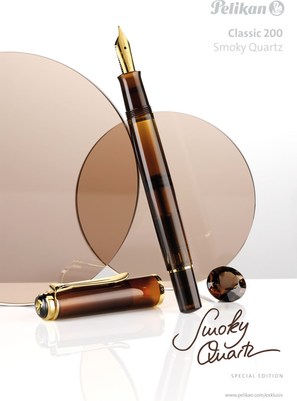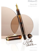 Anders als vorherige Serien, setzt die Serie 200 Smoky Quartz vergoldete Akzente. Die vergoldeten Zierringe, der feine Pelikan Schnabelclip und die vergoldete Edelstahlfeder bilden eine perfekte Harmonie mit dem rauchigen Braunton des Smoky Quartz.