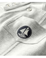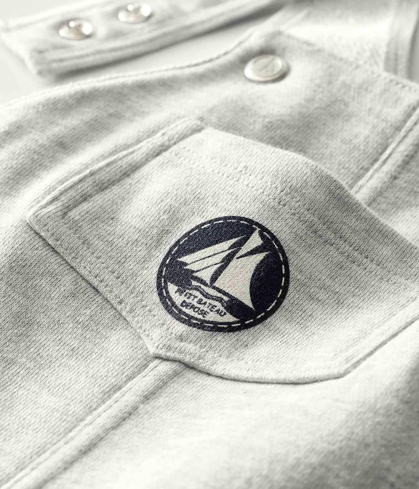 Bequeme Latzhose aus Molton in grau mit kleiner Brusttasche und Logo-Siebdruck von PETIT BATEAU für Jungen. Die Träger sind dank Druckknöpfe verstellbar, weitere Druckknöpfe im Schritt und an den Seiten erleichtern das An- und Ausziehen. Der vordere Latz ist von Innen mit einem Baumwollmaterial mit Sternen-Print in dunkelblau gefüttert. Auf der Rückseite befinden sich zwei Gesäßtaschen.
