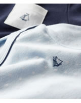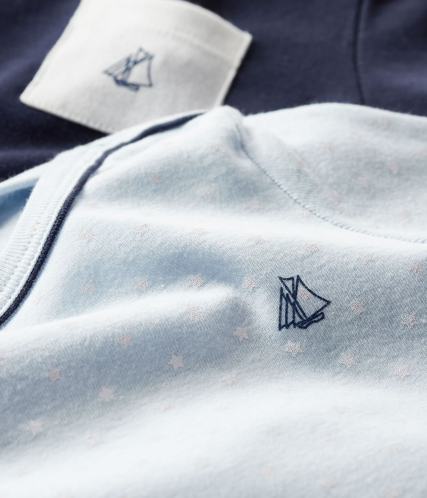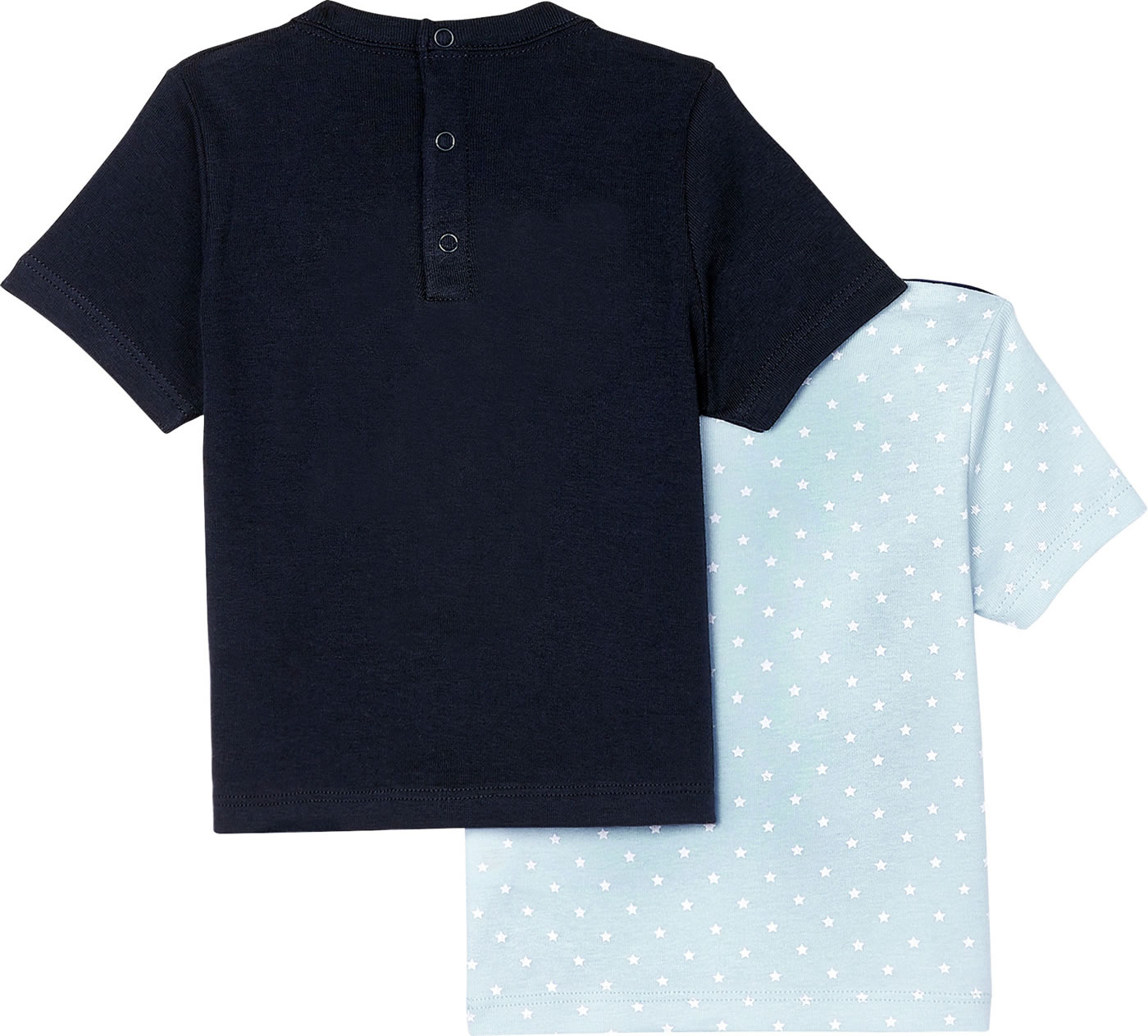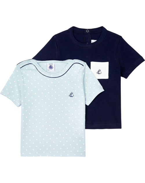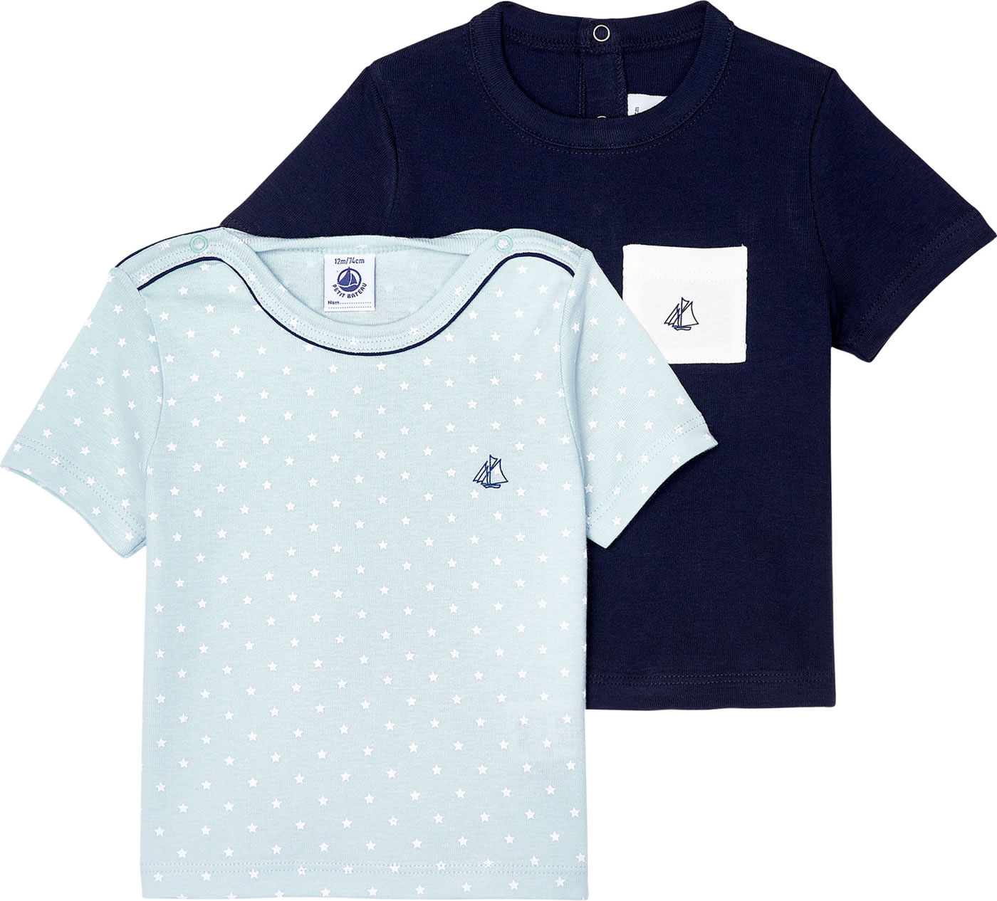 Tolles Set von PETIT BATEAU bestehend aus zwei Kurzarm-Shirts, ein Shirt in hellblau mit Sternen in weiß und eins in dunkelblau mit Brusttasche in weiß. Auf beiden Shirts befindet sich das kleine Petit Bateau Segelboot-Logo auf der Vorderseite.