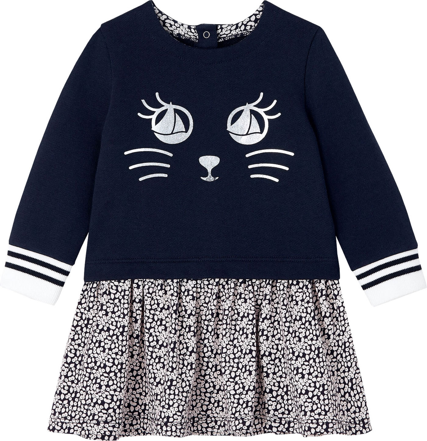 Dieses verspielte Langarm-Kleid aus Molton mit geripppten Streifen-Bündchen an den Ärmeln und niedlichem Katzen-Print von PETIT BATEAU lässt sich zu jeder Gelegenheit tragen: ob in der Freizeit bei festlichen Anlässen. Der Print schimmert in der Farbe silber. Der winterlich gemusterte Faltenrock aus 1x1 Rippstrick schwingt bei jeder Bewegung und das weiche Material sorgt immer für einen hohen Tragekomfort. Dank der Druckknopfleiste am Rücken lässt sich das Kleid leicht an- und ausziehen.