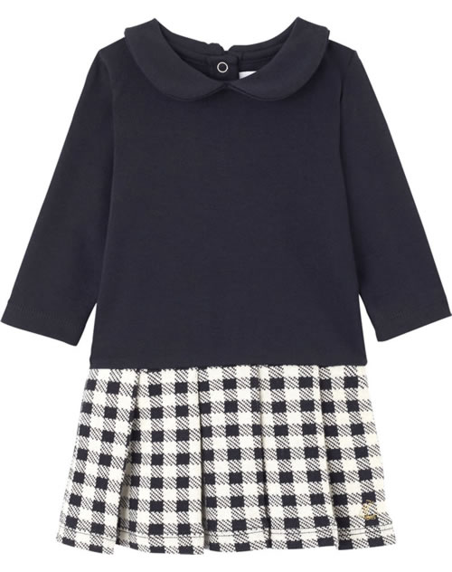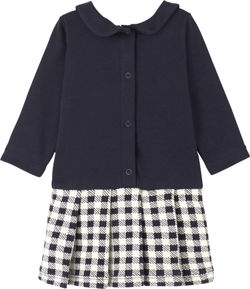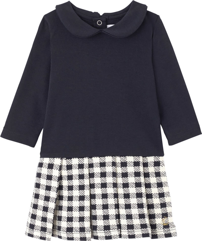 Dieses Baby-Langarmkleid von PETIT BATEAU spielt mit einem raffinierten Materialmix, wobei das Oberteil aus einfarbigem 1x1 Rippstrick und der Rock aus kariertem Interlock-Jacquard gearbeitet ist. Die tief sitzende Taille verleiht dem Kleid eine charmante Note und die Druckknöpfe am Rücken erleichtern das An- und Ausziehen. Raffinierte Details wie der Bubikragen und der plissierte Rock runden das Design ab. Ein zauberhaftes Kleid im Materialmix, das nicht nur toll aussieht, sondern auch echt praktisch ist.
