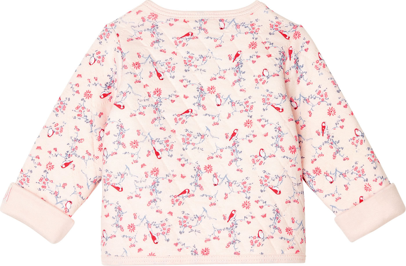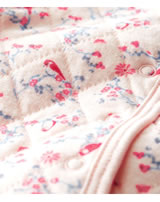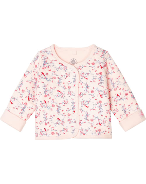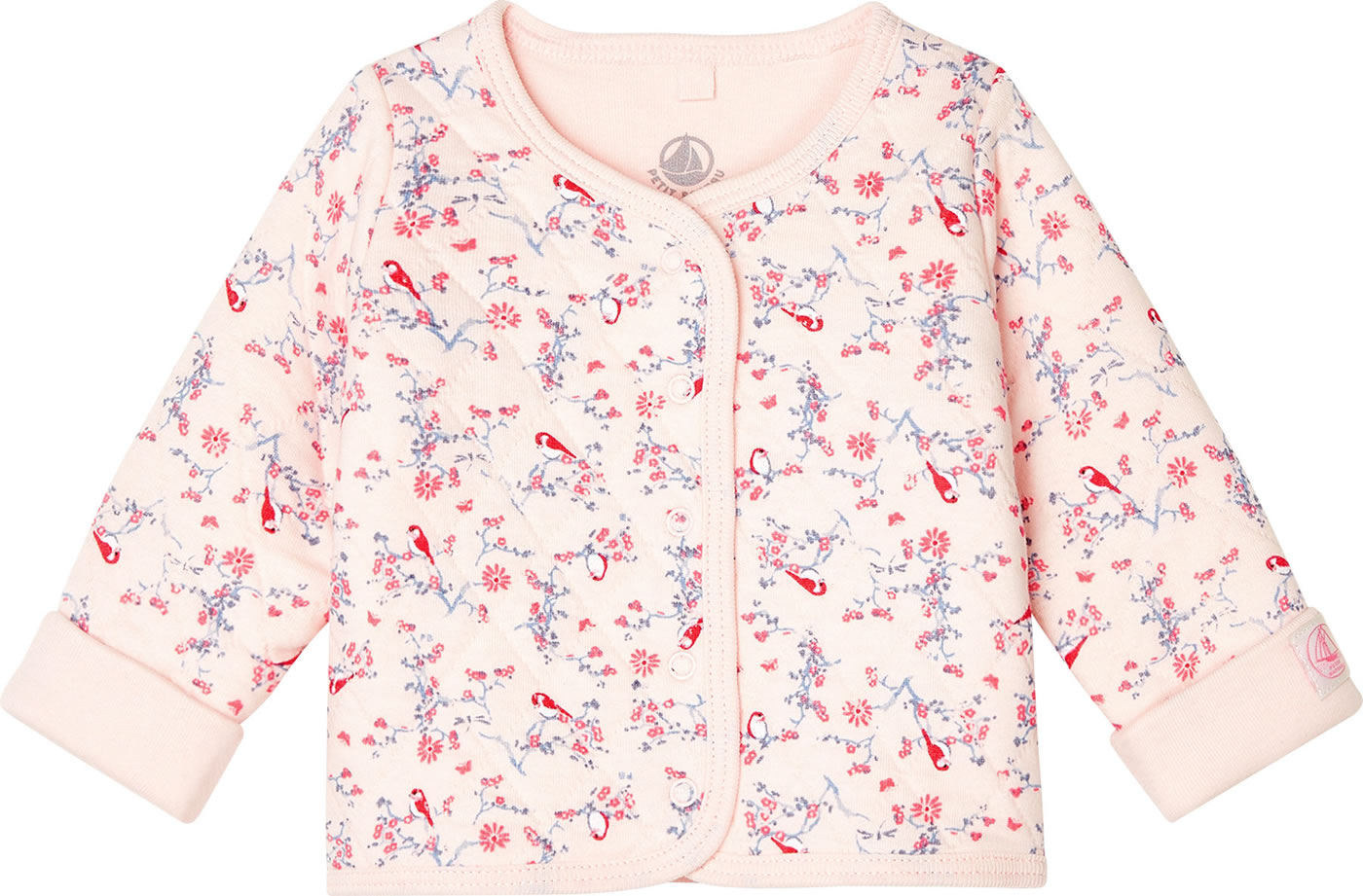 Floral bedruckte Jacke in rosa und blau mit Druckknopfleiste von PETIT BATEAU für Mädchen. Im Blumenmuster verstecken sich hübsche Vögel, die einen schönen Farbkontrast erzeugen. Das weiche Material ist sanft zu Babys Haut.