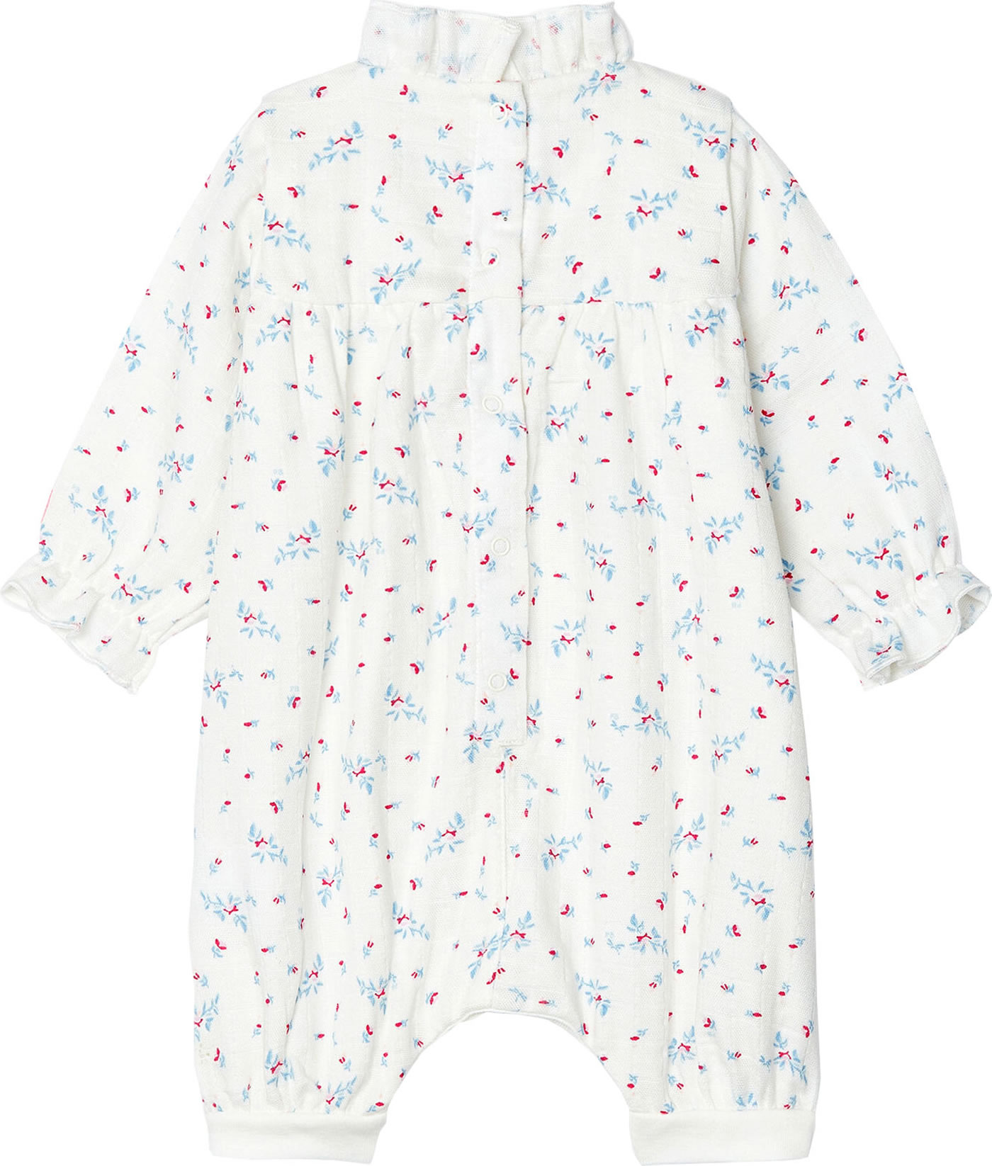 Von Innen ist er mit einem weichen Baumwoll-Futter gearbeitet. Eine lange Druckknopfleiste vom Hals bis zum Beinende erleichtert das An- und Ausziehen. Zusätzliche Druckknöpfe im Schritt helfen beim schnellen Windelwechseln.
